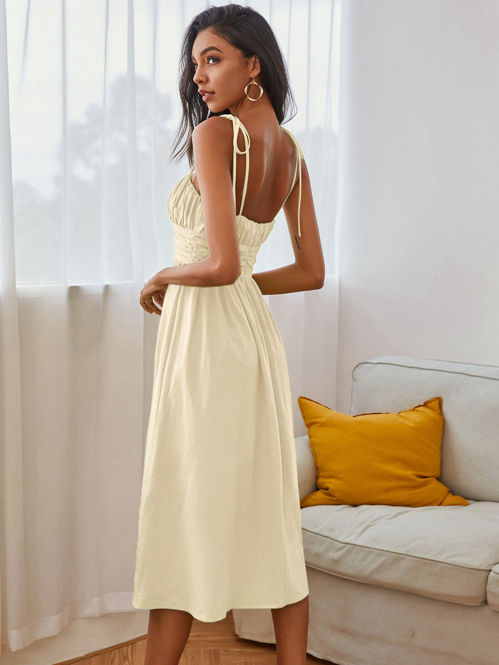 Main character vibes 锟斤拷C With dainty tie-straps. a stylish ruched bust. and a flattering wide skirt. you'll feel like the main character every time you step out.