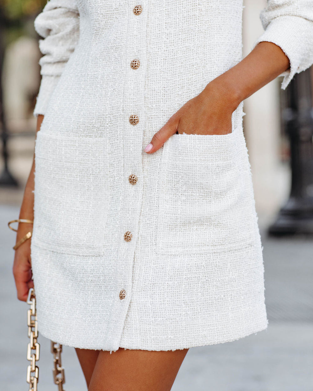 Posh and polished. the Alexandria Pocketed Button Down Tweed Dress in ivory can be worn open as a jacket or closed as a dress.