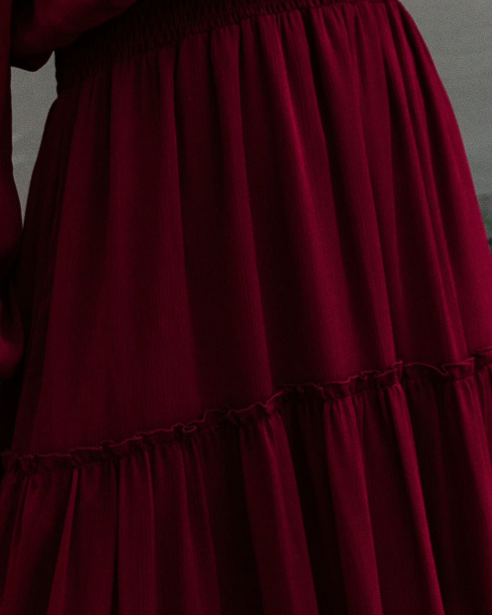 Sweet meets sassy in the Alicia Off The Shoulder Tiered Midi Dress! This deep burgundy colored long sleeve dress features a delicately ruffled tiered body with crepey fabric. Wear this stunner to your next holiday event paired with simple heels and a clutch. Styled with the On Demand Herringbone Necklace. Virtue Coin Medallion Necklace. Stella Crossbody Envelope Zip Clutch. and Larkin Heel.