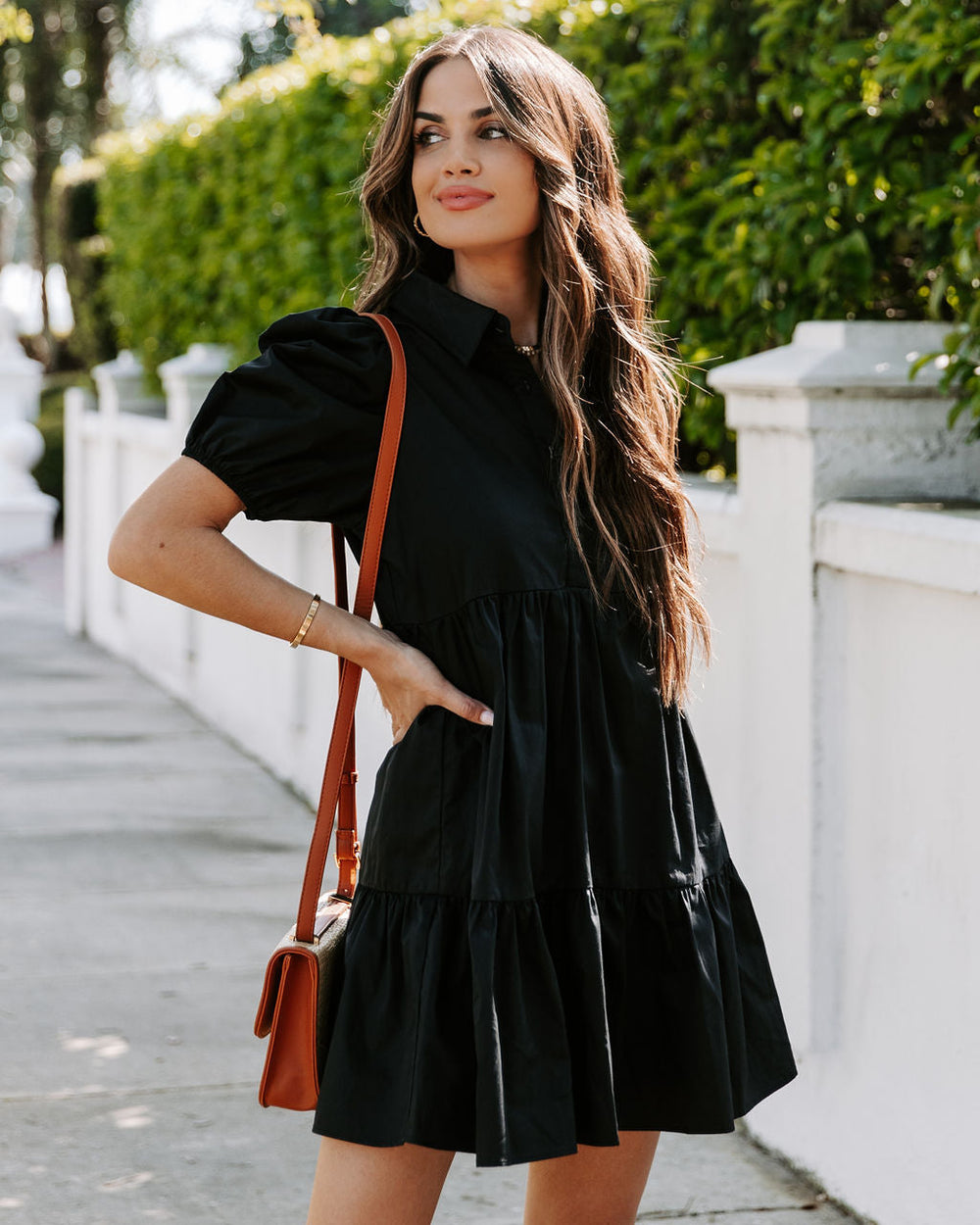 Posh and preppy. the Aliza Cotton Button Down Babydoll Dress in black features a collared neckline.