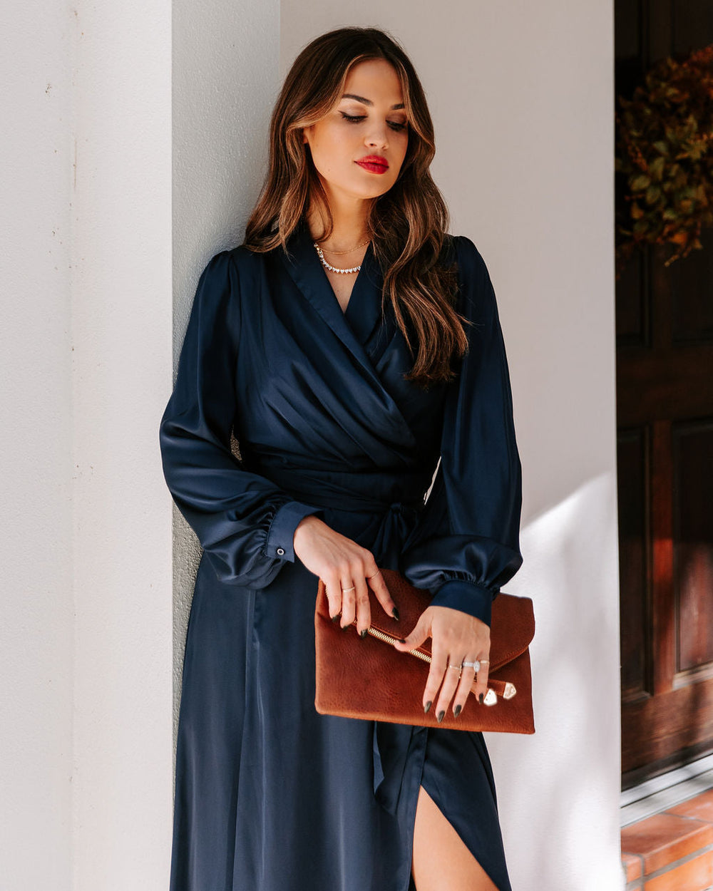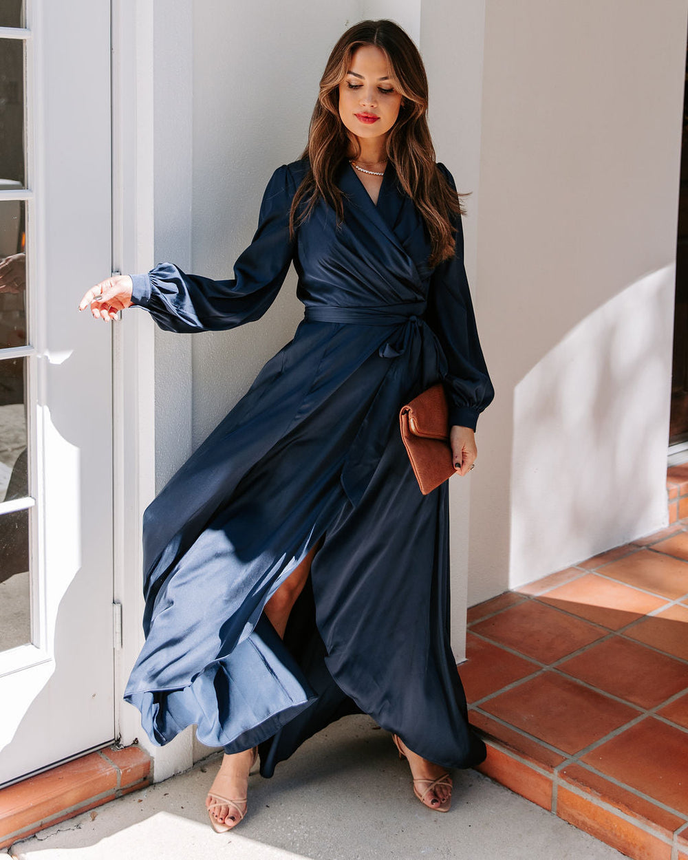InsStreet Host an elegant dinner party in our Always Memorable Satin Maxi Dress! This glowing navy maxi is cinched at the waist with an adjustable waist tie. Finished with a draped neckline and a concealed zipper closure. Styled with the Elena Tennis Necklace. Stella Crossbody Envelope Zip Clutch. and Bella Faux Leather Strappy Kitten Heel.