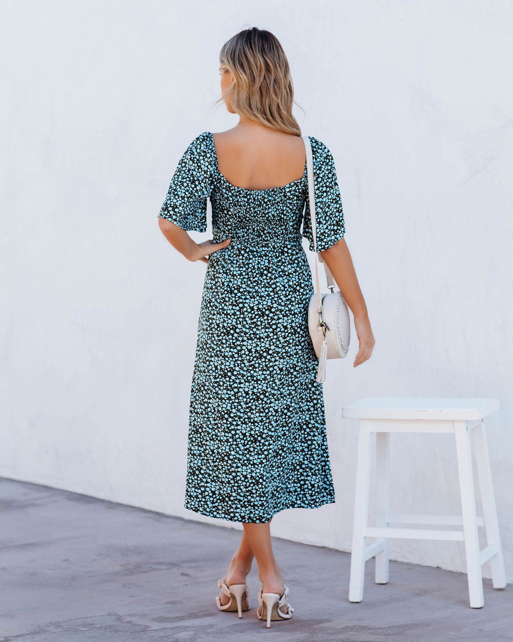 Our Andee Floral Cutout Midi Dress is perfect for a day date! Black. blue. white. olive. and orange florals detail this midi. Designed with a front lace tie and a side slit. Finished with a scooped neckline. Styled with the Roxy Hoops. 5 Disc Choker. Compass Coin Necklace. Round Town Crossbody Bag. and Wilma Square Toe Scrunch Heel.