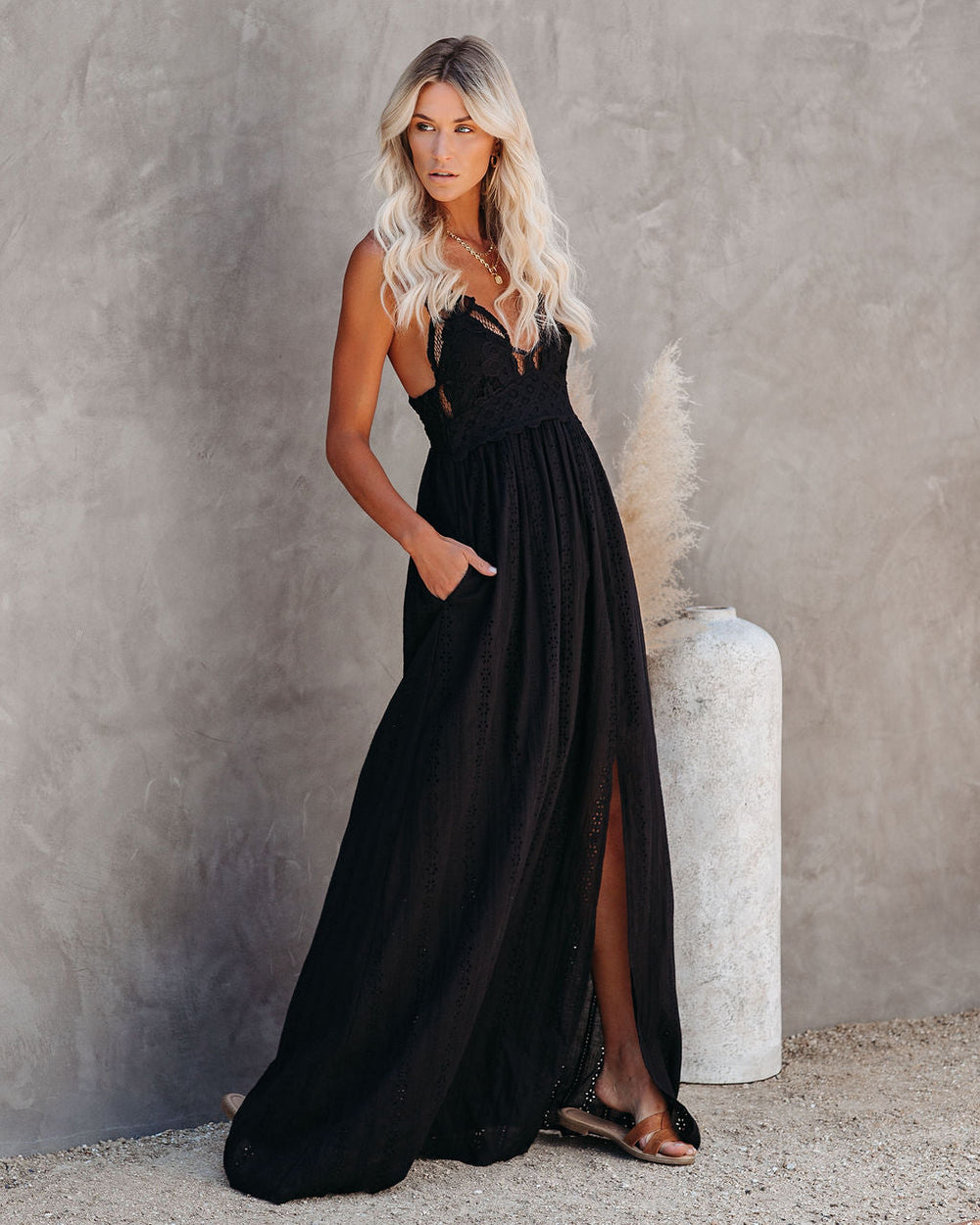 Our Archer Pocketed Lace Eyelet Maxi Dress commands attention! This beauty features a black foundation that's ornately crafted with lace florals and fine eyelet details. Rendered with adjustable criss cross straps and a smocked back bust for a supportive and uplifting fit. A high side slit adds an alluring touch to elevate the look! Finished with side pockets. Styled with the Armadillo Hoops. Chloe Mini Necklace. Sia Toggle Pendant Necklace. Kelsey Chain Bracelet. Brianne Twisted Faux Leather Sandals and the Stella Crossbody Envelope Zip Clutch.