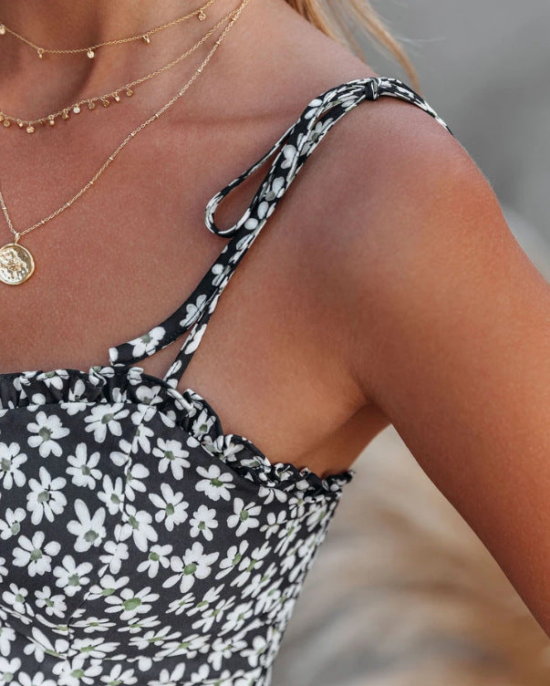 Show off your femme side in the Avril Floral Smocked Tie Mini Dress with navy. ivory. and sage florals and a fixed bust tie.
