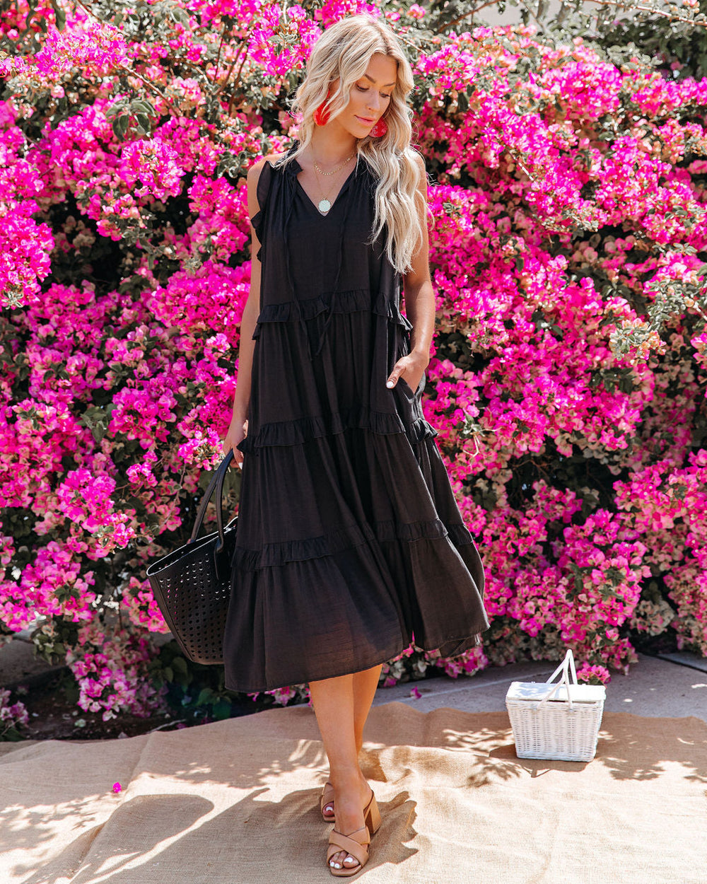When it's hot outside but you have a fancy event. throw on our Ballard Cotton Blend Pocketed Tiered Midi Dress with slide sandals! This black textured fabric midi dress features a ruffled trim and side pockets. Styled with the Gasparilla Beaded Statement Earrings. Chloe Mini Necklace. Mosaic Coin Necklace. Palmas Perforated Faux Leather Tote Bag. and Twiggy Criss Cross Heeled Sandal.