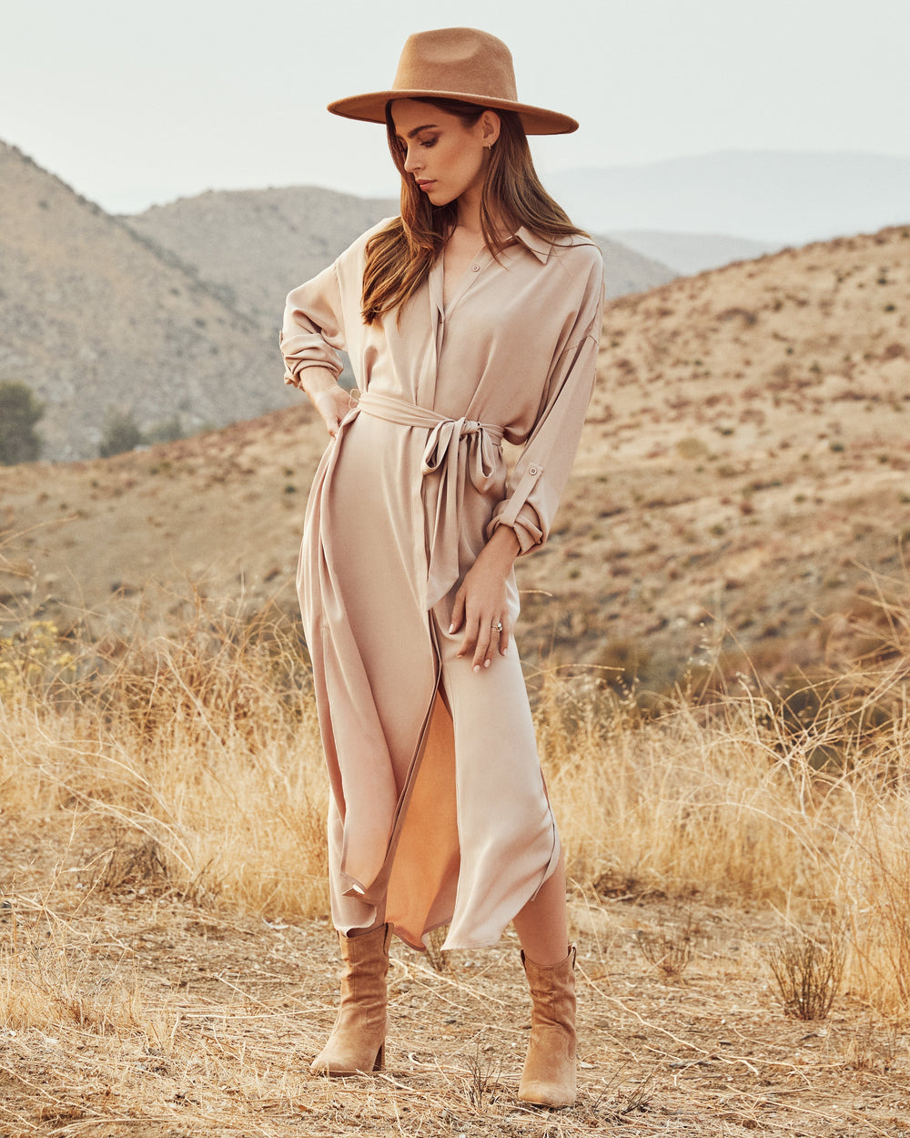 //INSSTREET// A collared dress paired with a wide brimmed hat is a western themed dream! Our Betsy Button Down Midi Dress comes in a classic nude hue. Designed with an adjustable waist tie. Styled with the El Dorado Hat. Walford Cropped Fringe Faux Suede Jacket. and Dev Faux Suede Heeled Bootie.