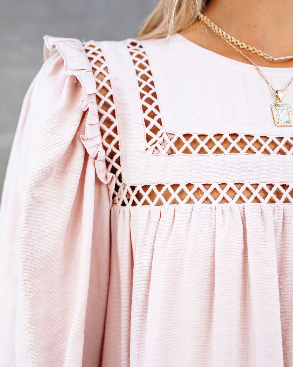 An easy. breezy outfit is complete in our Canyon Pocketed Tiered Babydoll Dress! This blush crew neck dress has a ladder lace chest detailing and side pockets. Finished with a back button closure with a keyhole. Styled with the Mercedes Hat. Michaela Hoops. Lou Tag Necklace. Initial Card Necklace. Highland Bag. and Leanna Faux Suede Heeled Boot.