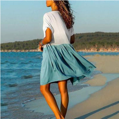 Our Carmen Pocketed Colorblock Babydoll Dress is beachy boho! Sage. seafoam. and olive hues detail this dress. Designed with a v-neckline and side pockets. Finished with a neckline tassel tie closure. Styled with the Mercury Hoops and Ana Gold Coin Lariat.