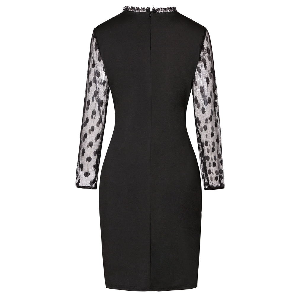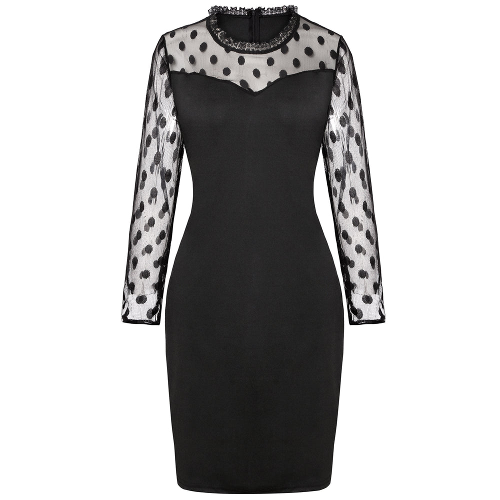 Go for girly glam in our Carmina Statement Sleeve Bodycon Dress! This black fitted dress features sheer polka dot sleeves. Secured with a back zipper closure. Styled with the Carson Black Frame Dark Smoke Polarized Sunglasses. Chloe Mini Necklace. Compass Coin Necklace. Chic Crossbody Chain Pouch Bag. and Whimsy Heel.