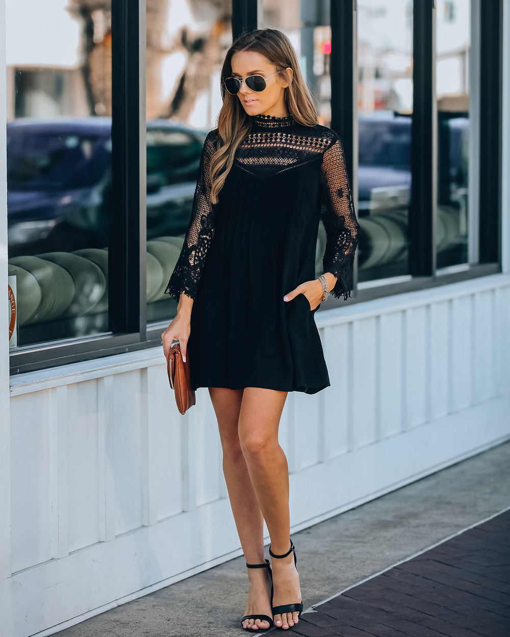 //Best Seller// New Color// We are just fawning over the City Of Love Pocketed Crochet Lace Dress! This beautiful. crochet lace detailed black dress is so flowy and fabulous. It has scalloped sleeve hems and a sheer crochet lace neckline C so dreamy! There is sewn front pleating. front and back ladder lace detailing and side pockets C it's all about the details. Style this dress for your next romantic occasion with a pair of nude heels and you will fall in love! Styled with the Kelsey Chain Bracelet. Stella Crossbody Envelope Zip Clutch. and Whimsy Heel.