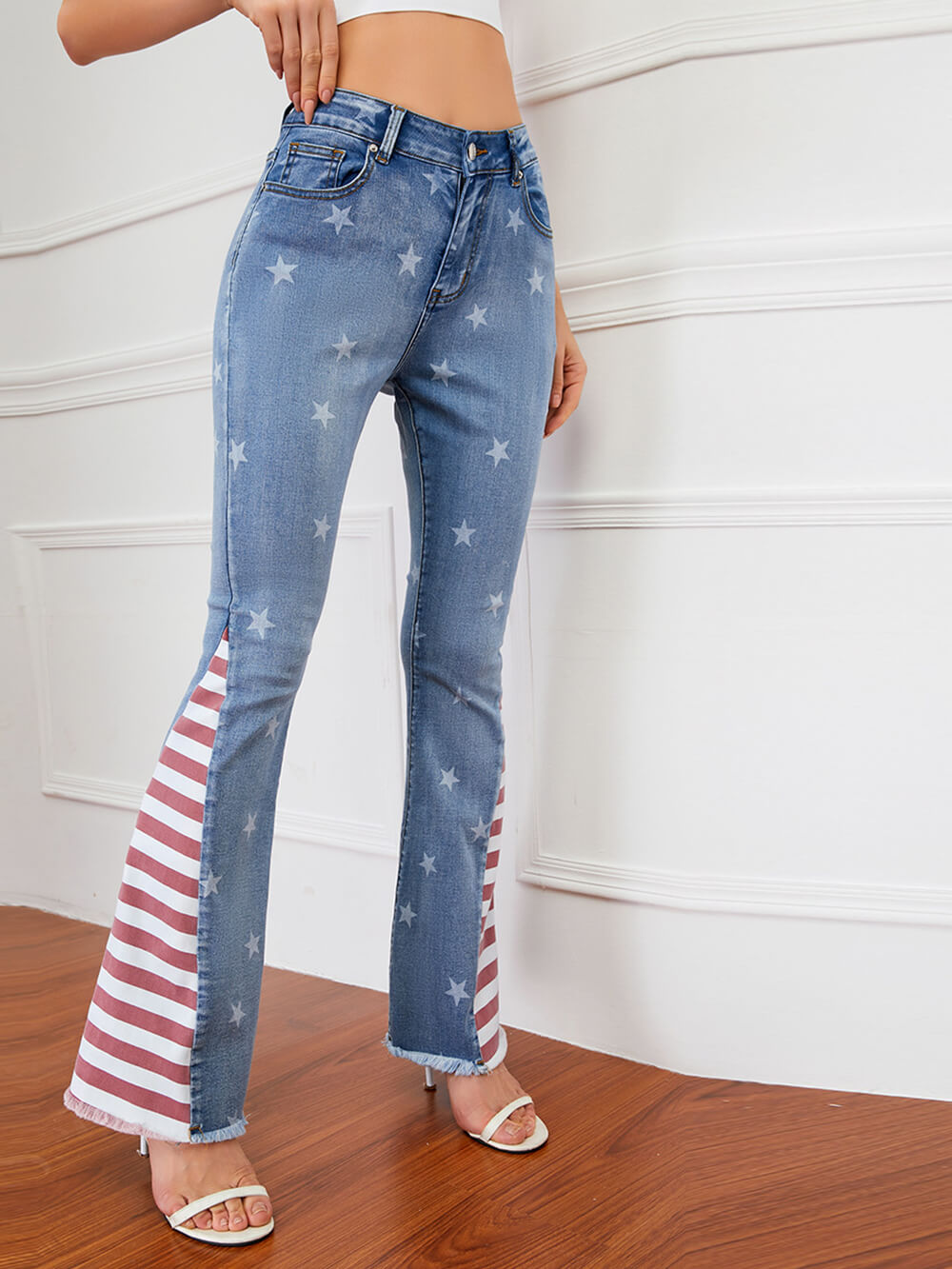 These jeans are not just denim; they're a canvas of creativity. The unique combination of printed stars and colorblock stripes creates an eye-catching and dynamic visual that's sure to make a statement wherever you go.