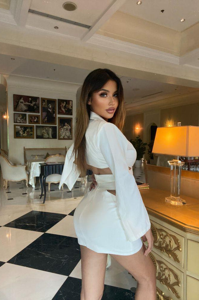 Little white dresses for the party season. This cutout wrap front blazer mini two-piece dress in our boutique can be dressed up and down from day to night this season. Completed with a cropped blazer with a lapel collar. long sleeves with slit cuffs. a wraparound straps with hook & eye closure at back. and the matching mini skirt with a high rise waistband. a hidden zip closure at back and cut-outs at sides. this minimal matching set is a unique back-to-office outfit of blazer dresses for women. Pair it with thigh-high boots to update your next office look.