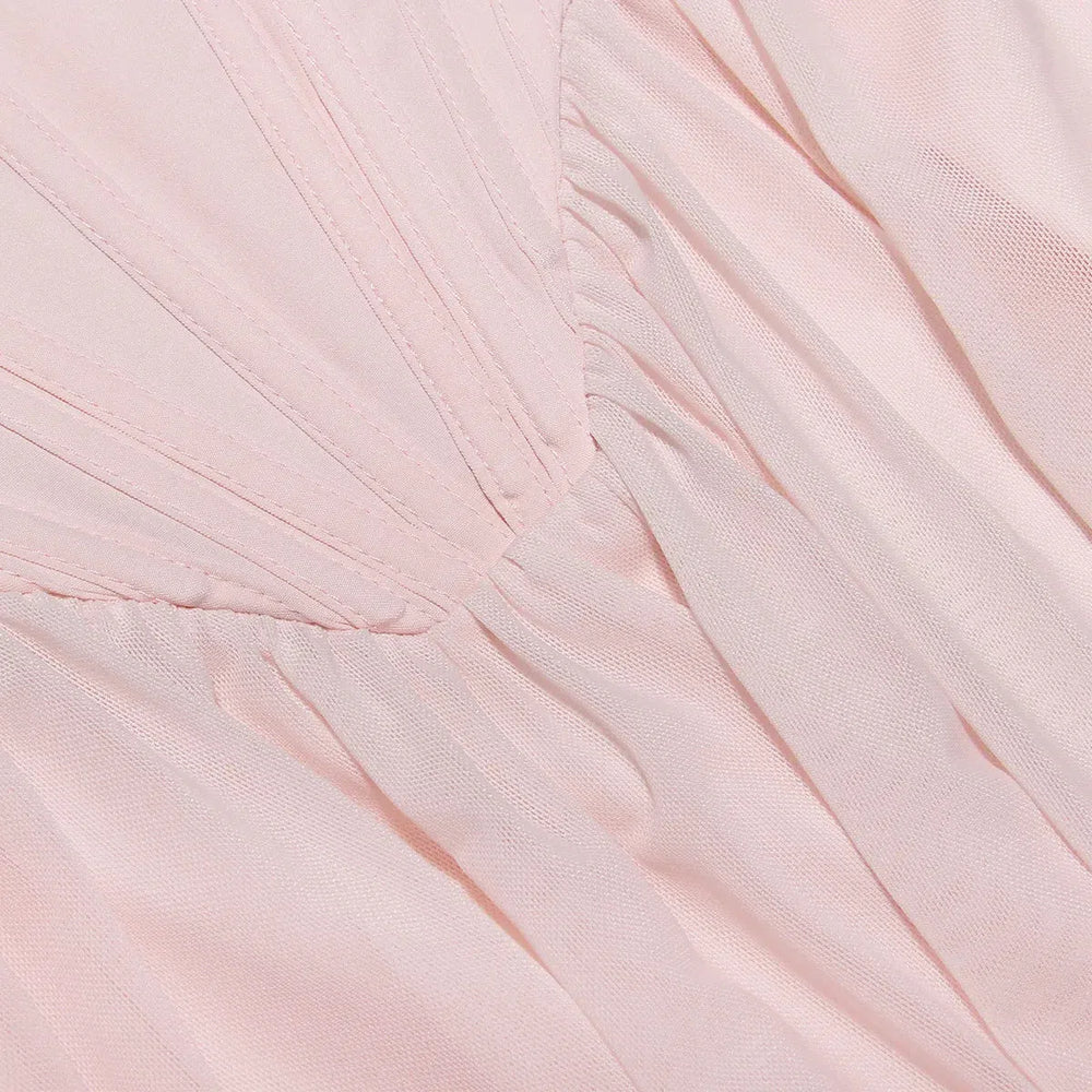 Featuring a finely crafted corset bodice that highlights the silhouette, paired with a flowing mesh skirt for a touch of ethereal charm. The long sleeves and delicate pastel color enhance its feminine appeal, making it perfect for special occasions where you want to feel both empowered and graceful. This dress is a testament to sophisticated style with a youthful twist.