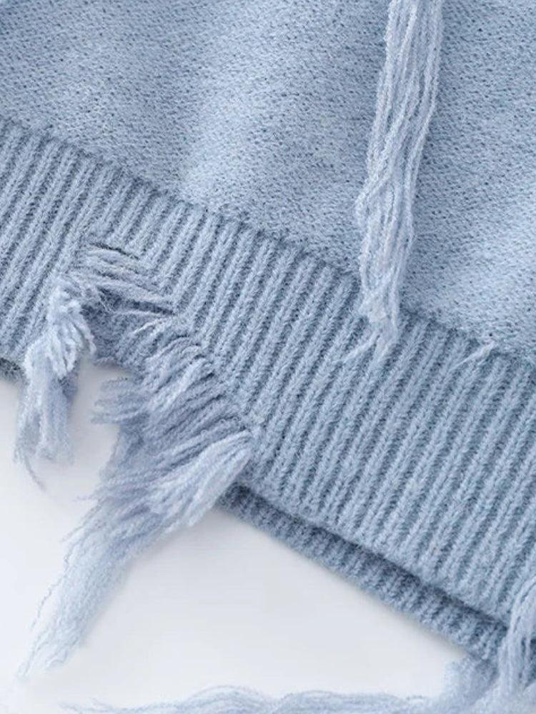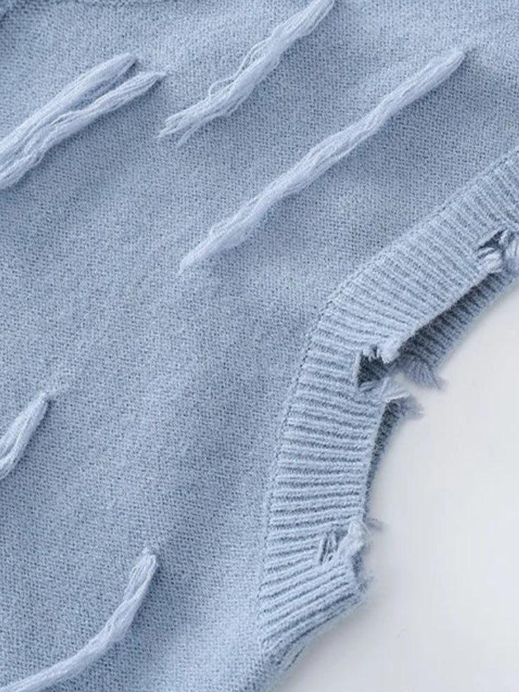 Embrace an edgy look with this unisex sweater vest, crafted from knit material and featuring ripped details at the collar, shoulders, and hem. It's a versatile piece for streetwear enthusiasts, suitable for both cool fall days and winter weather.