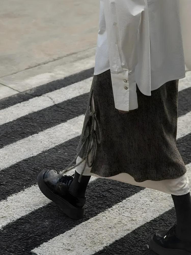 This A-line midi skirt captures the essence of fairy grunge with its lace-up details and cream lining. Its enchanting aesthetic makes it a versatile piece for casual outings, cozy gatherings, or streetwear looks in the fall. A charming addition to any wardrobe.