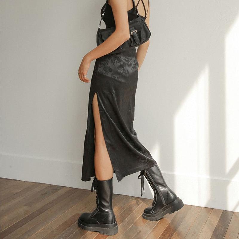 Introducing our Dark Floral Side Slit Midi Skirt, a stunning addition to your wardrobe.
