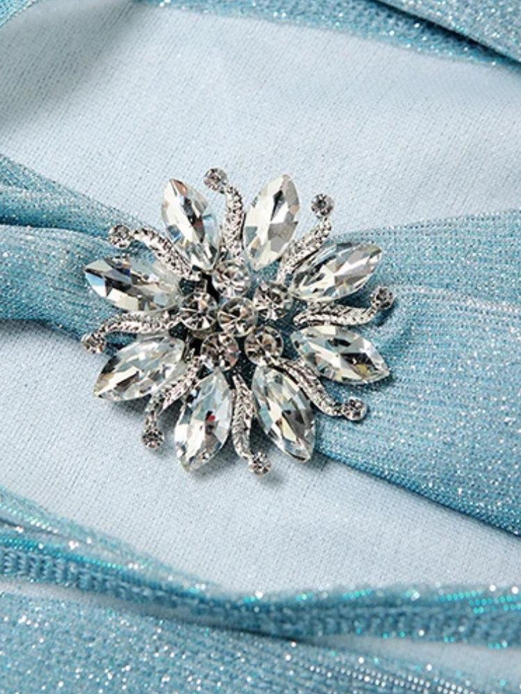 Channel your inner siren with this mermaidcore glitter mini dress. Designed with shimmering fabric, a halter-style neckline, and bold cutouts, it hugs every curve with dreamy energy. The rhinestone brooch detail adds a luxe finish—perfect for parties, club nights, or main character moments.