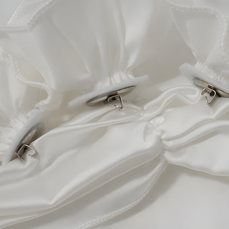 This satin masterpiece brings luxury to life with a sculptural silhouette and dramatic backless design. The halter neckline drapes elegantly, while the ruffled hem and satin roses add couture-level charm. A showstopper for any evening affair.