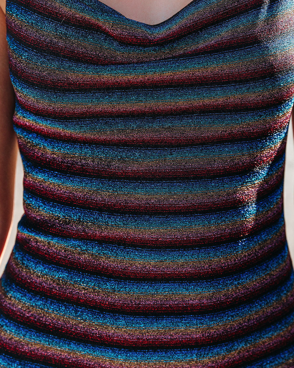 Our Dance More Striped Shimmer Maxi Dress is ready for a night out! Black. fuchsia. gold. red. pink. blue. and teal shimmery stripes detail this dress. Designed with a cowl neckline. Styled with the Showstopper Statement Earrings. Chic Crossbody Chain Pouch Bag. Chloe Mini Necklace. and Chevelle Rhinestone Heel.
