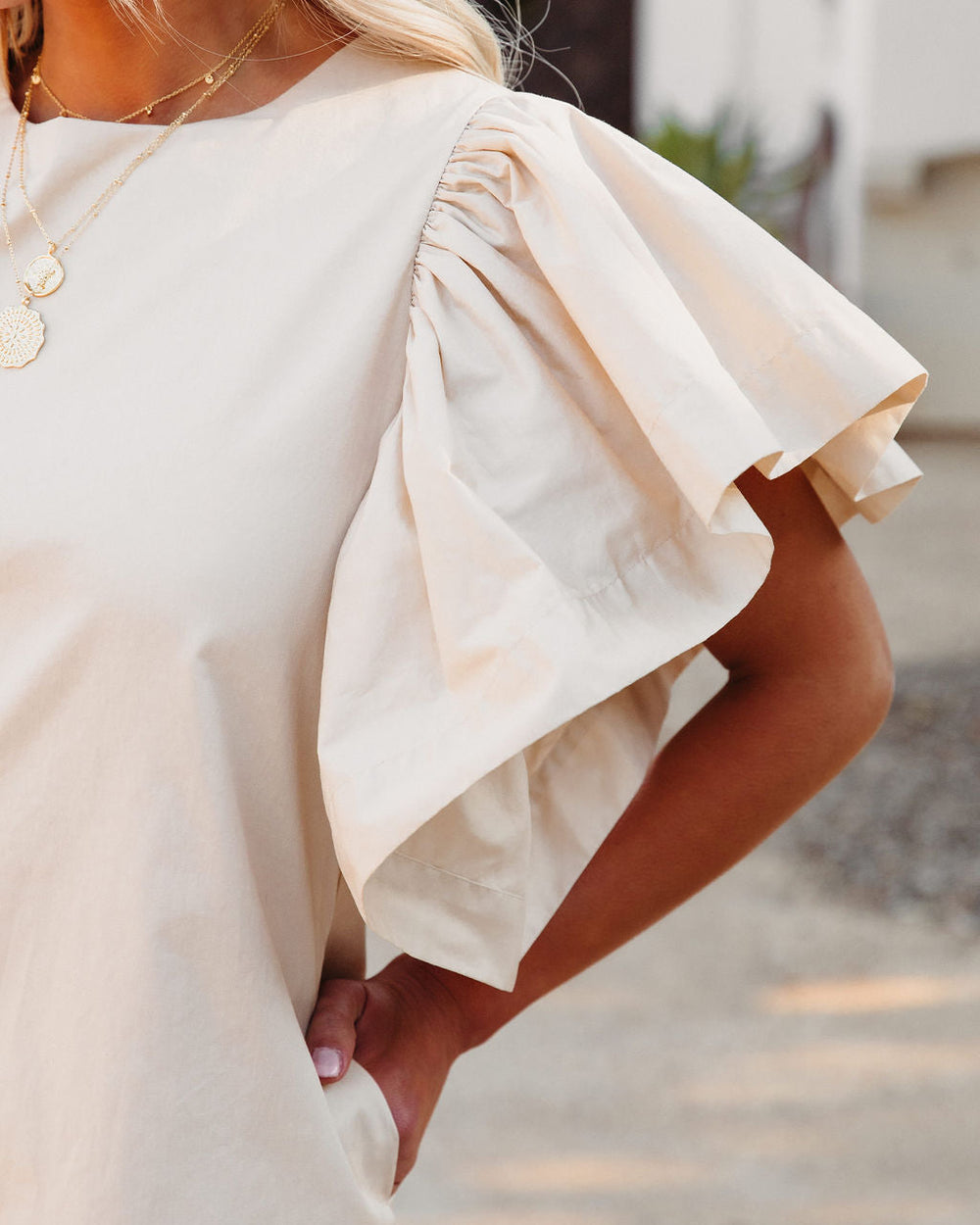 Bring the drama in the Davina Cotton Pocketed Midi Dress in khaki with a crew neckline and statement sleeves.