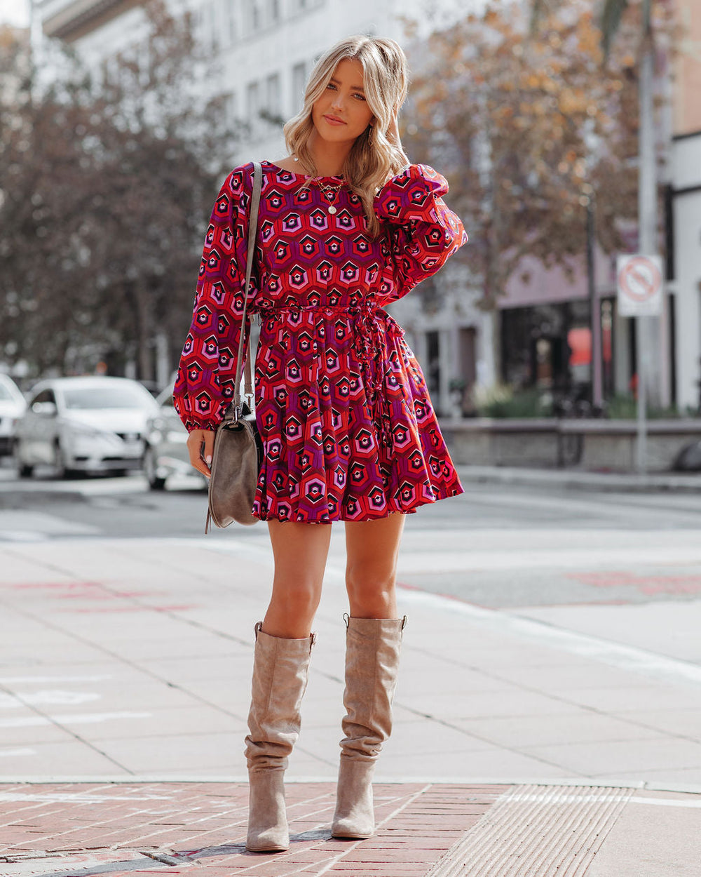 Introduce retro vibes to your wardrobe in the Dorsey Cotton Printed Rope Tie Ruffle Dress with wine. pink. burgundy. and black hues and a ruffled hemline.