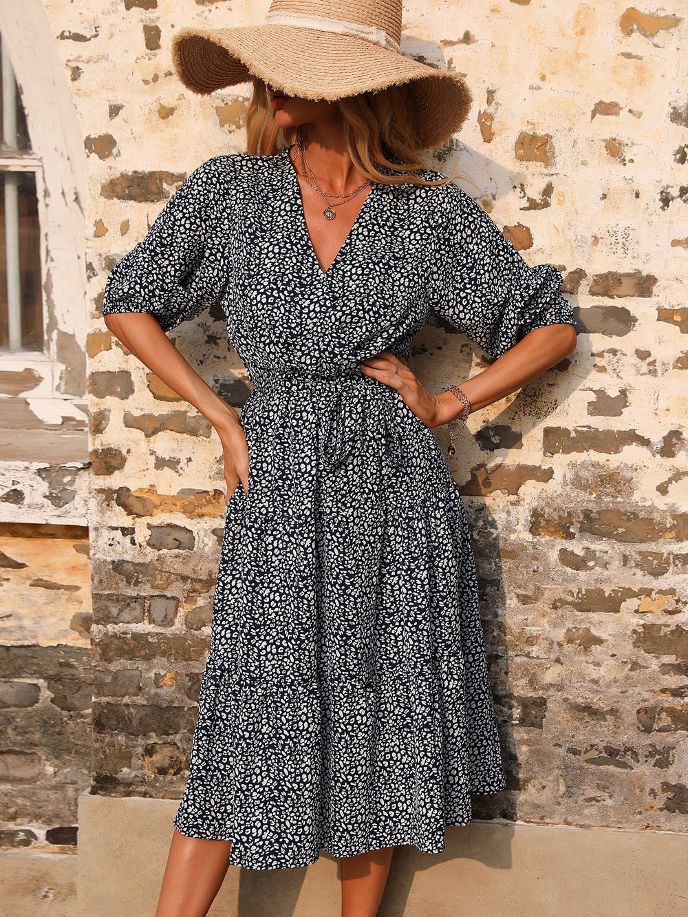 Try this cutout midi with a cool black boot! Our Enzo Printed Cutout Maxi Dress features black and beige florals. Designed with an elastic waistband and a flowy skirt. Finished with a back adjustable tie closure. Styled with the El Dorado Hat. Perfect Hoop Earrings. Chloe Mini Necklace. The Buddha Wheel Necklace. Simple Bangle Bracelet. Stella Crossbody Envelope Zip Clutch. and Ritz Faux Suede Pointed Heel.