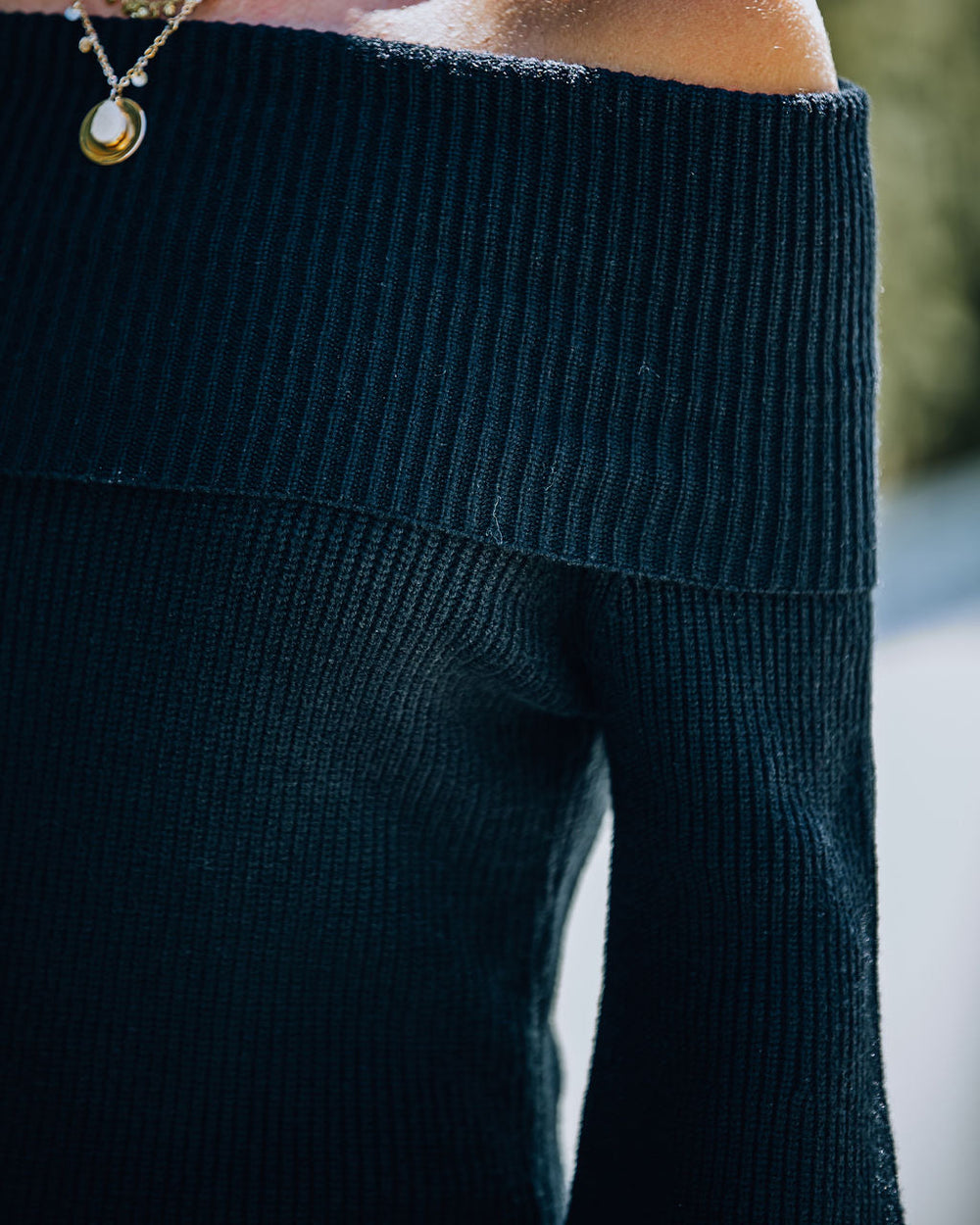 We love a sweater dress with OTK boots! Our Greer Off The Shoulder Sweater Dress comes in classic black. The long billowy sleeves add chic detail. You'll be wearing this fitted mini all season long! Styled with the Chloe Mini Necklace. Judah Pendant Disc Necklace. Stella Crossbody Envelope Zip Clutch. and Saint Slouch Boot.
