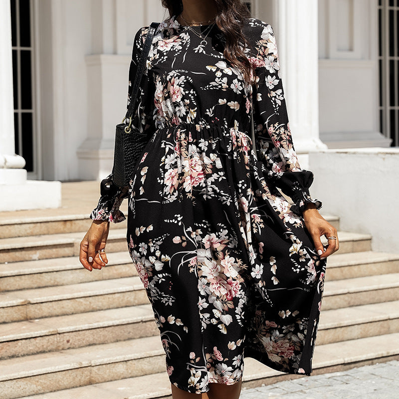 Our Jeha Floral Tie Dress comes in black with olive. charcoal. ivory. mauve. purple. and pink florals. Wear this femme dress with a clutch and heels. Finished with an adjustable waist tie. Styled with the Perfect Hoop Earrings. Chloe Mini Necklace. The Buddha Wheel Necklace. Simple Bangle Bracelet. Stella Crossbody Envelope Zip Clutch. and Saint Slouch Boot.