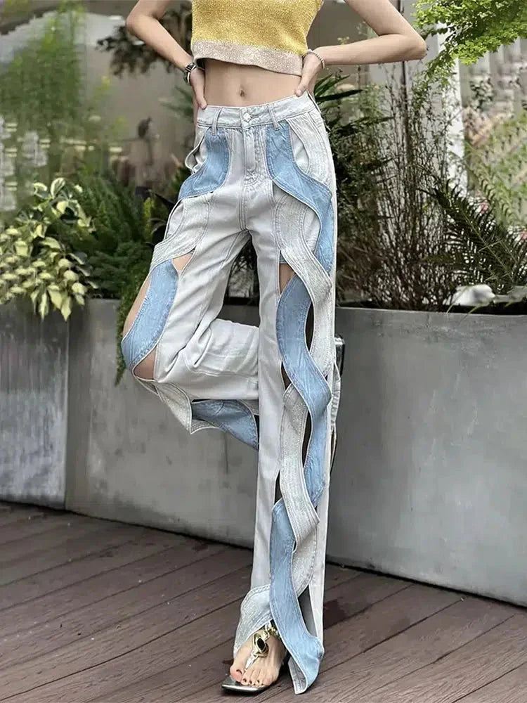 Make a bold fashion statement with these denim jeans. Featuring a unique design with stylish cut-outs and contrasting patches. these jeans offer a trendy and edgy look. The high-waisted fit and quality denim fabric ensure comfort and style. perfect for creating standout outfits.
