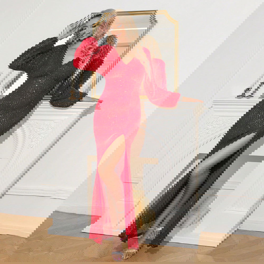 Puff Sleeve Deep V Plunge High Slit Sequined Cocktail Dress