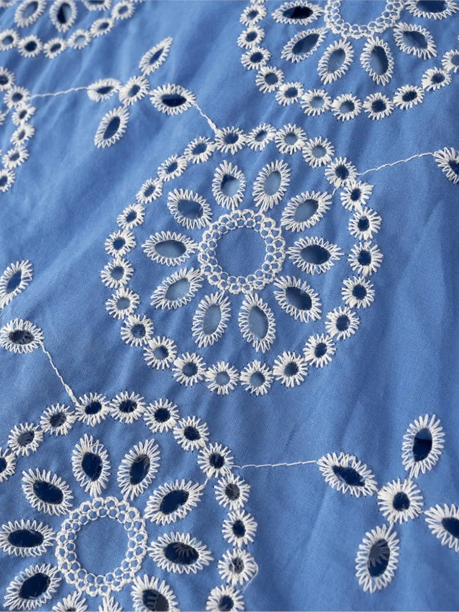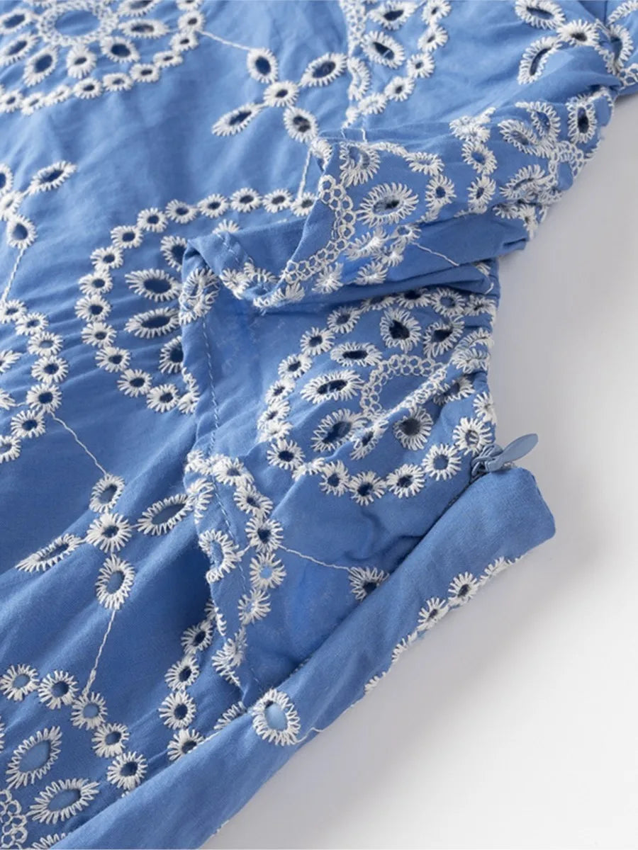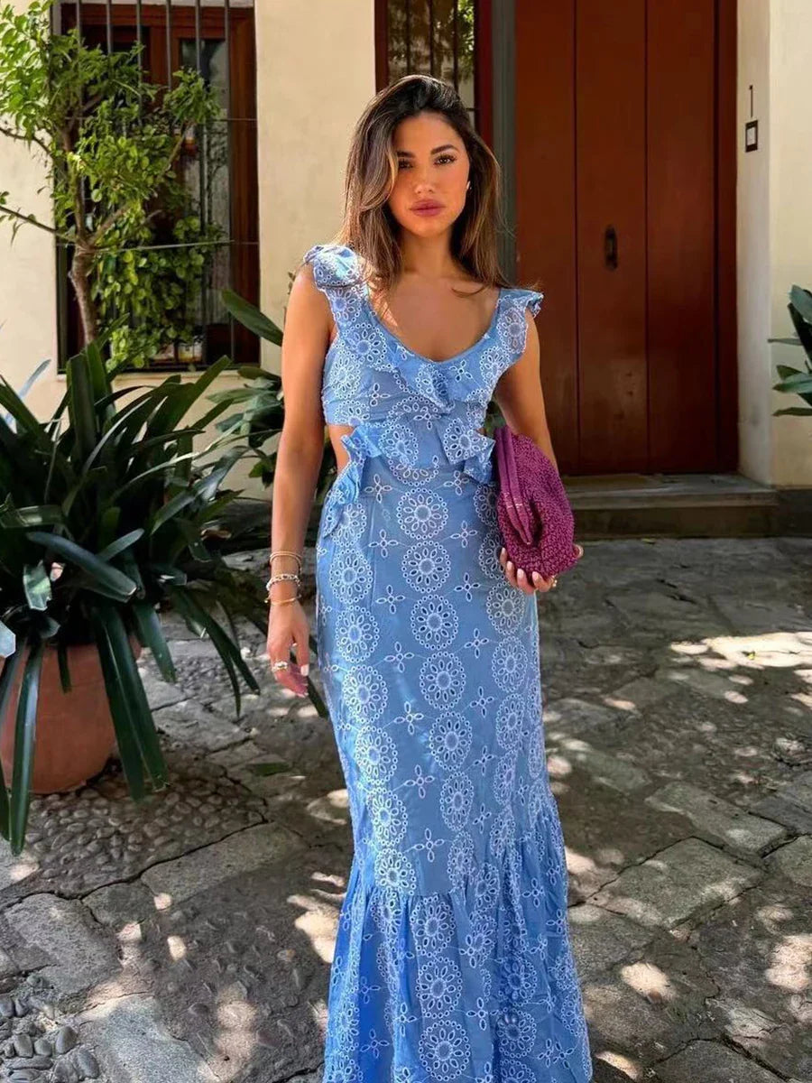Blue Hollow Out Embroidered Midi Dress Women Summer New V Neck Sleeveless Ruffle Long Dresses Elegant Fashion Holiday Vestidos