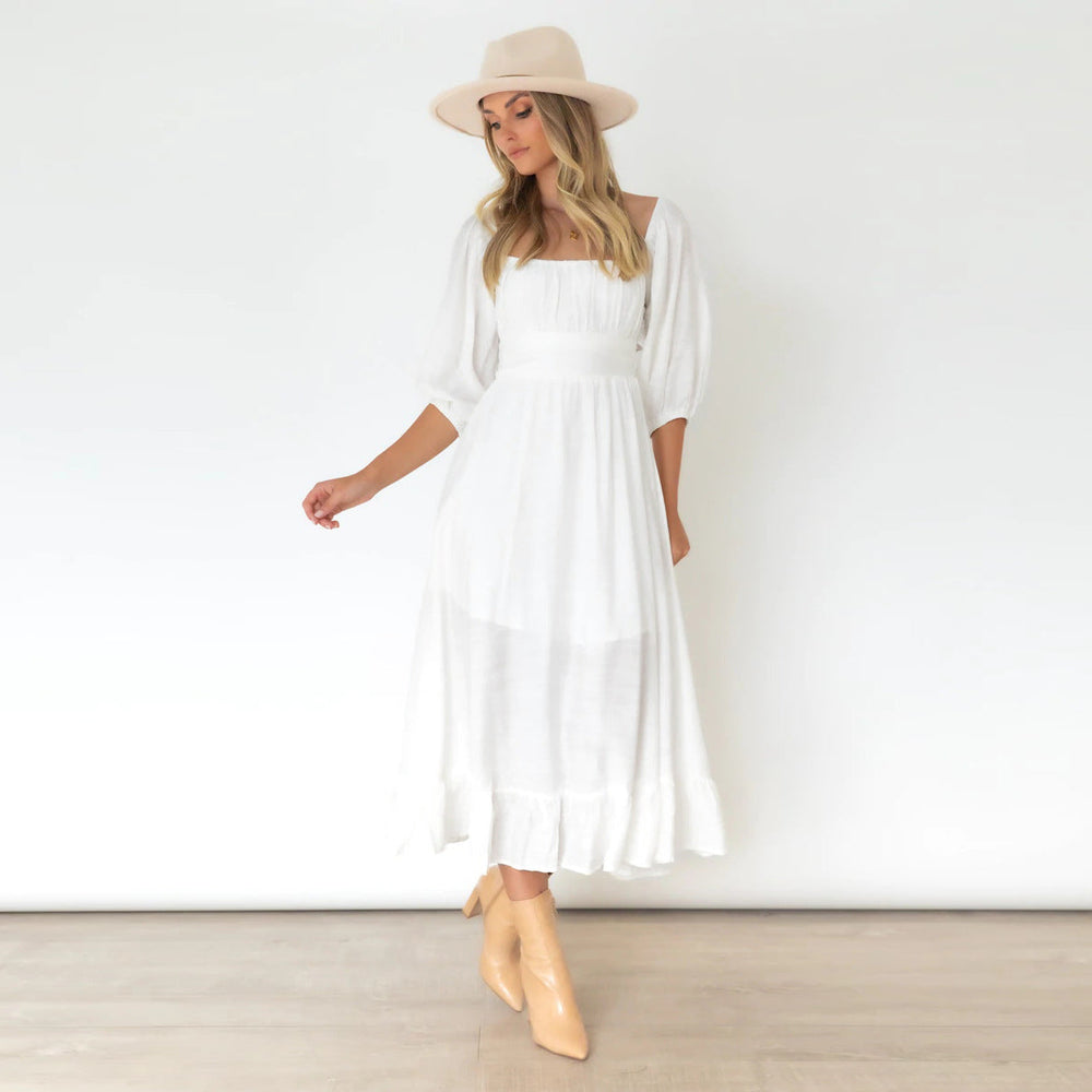 //INSSTREET// Our Katelyn Puff Sleeve Midi Dress is made for any warm-weather event in a light peach with a square neckline and puff sleeves.
