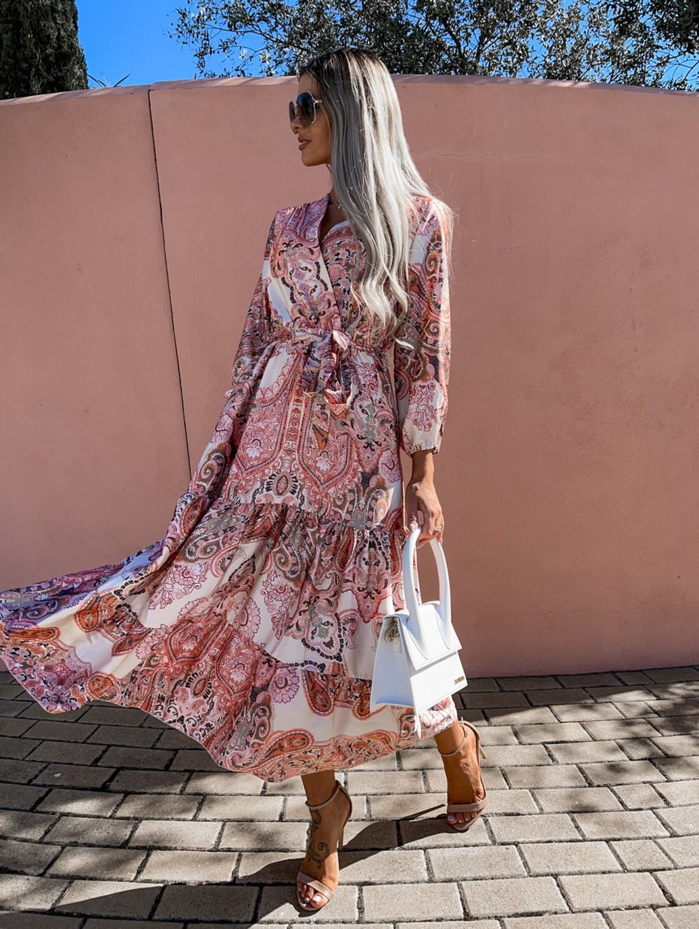//INSSTREET// Our Katerina Printed Tiered Midi Dress brings the femme vibes! Mauve. rust. orange. ivory. yellow. and pink florals detail this tiered midi. Finished with a split neckline and neckties. Styled with the El Dorado Hat. Gabi Hoops. 5 Disc Choker. Sia Toggle Pendant Necklace. Simple Bangle Bracelet. Stella Crossbody Envelope Zip Clutch. and Marant Faux Suede Heeled Scrunch Bootie.