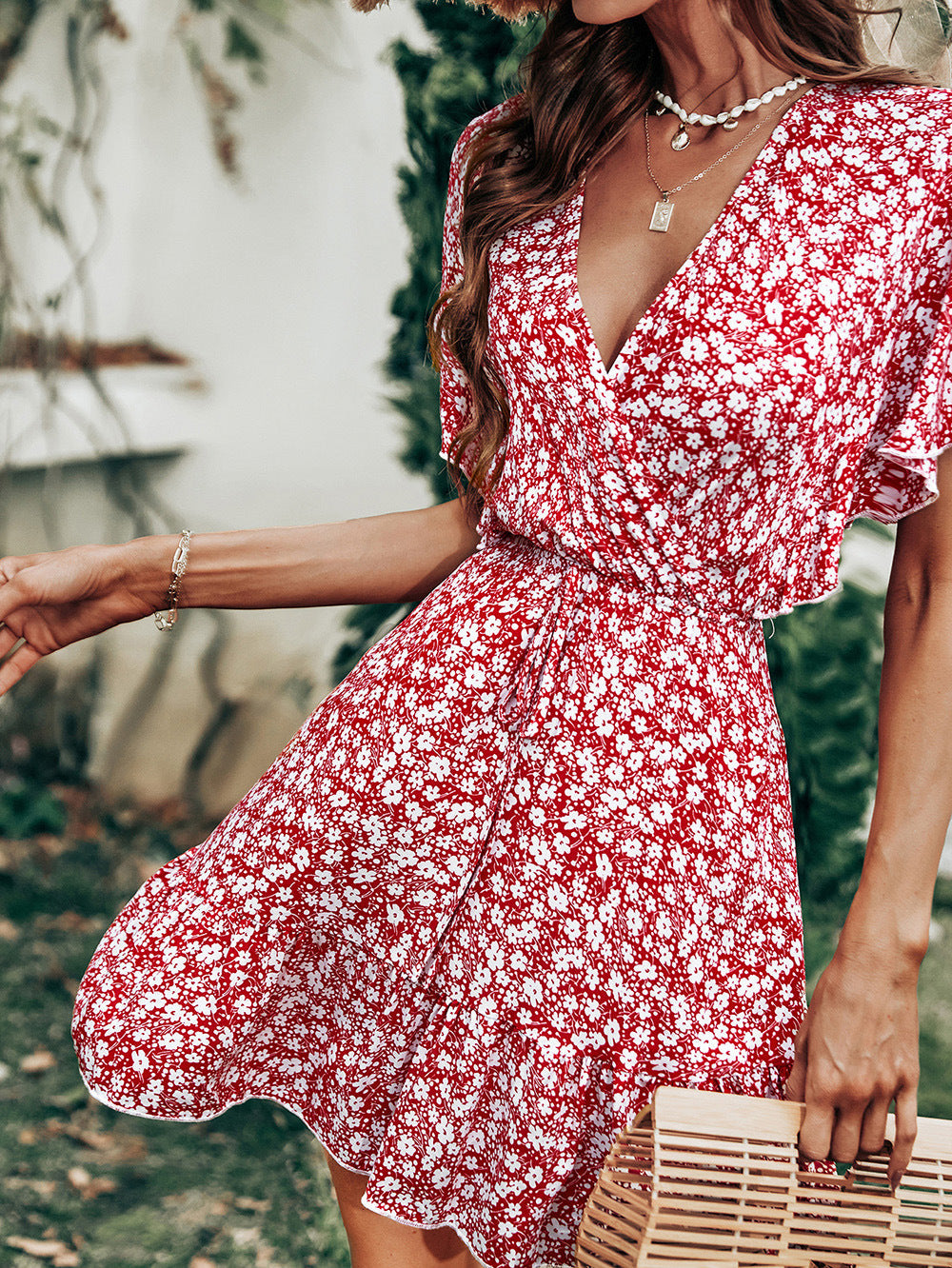 Our Layva Printed Ruffle Tiered Dress is relaxed boho! This mauve and wine floral printed mini is crafted with a smocked waistband. Designed with elastic cuffs and a split neckline. Styled with the Perfect Hoop Earrings. 5 Disc Choker. Gaia Coin Necklace. Simple Bangle Bracelet. Highland Bag. and Saint Slouch Boot.