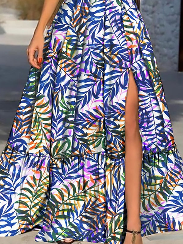 Leaf Print Deep V Neck Slit Sling Dress