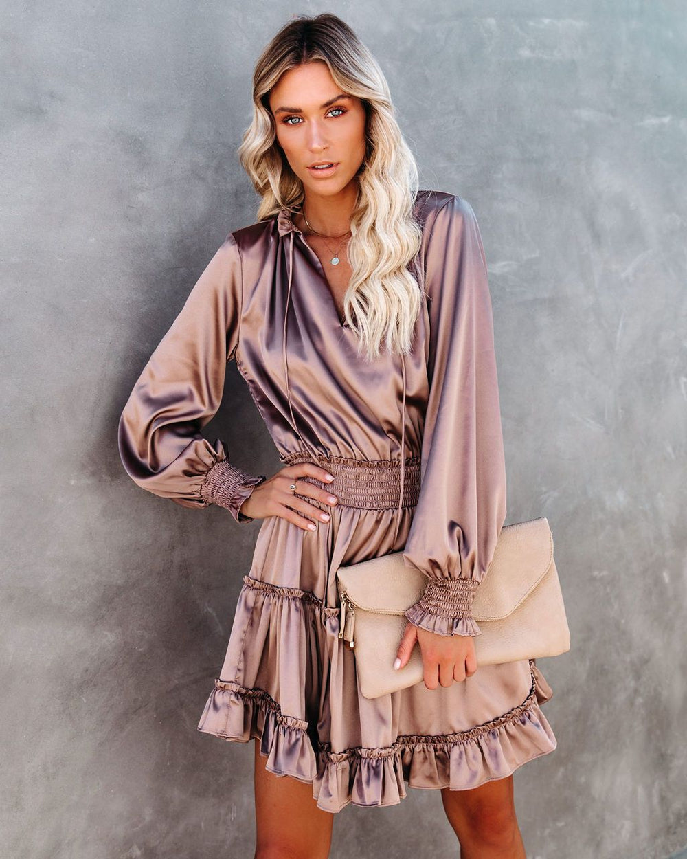 Our Lena Satin Midi Dress is so cute for work or fancy events! This champagne colored midi features a split neckline and an elastic waistband. Wear this long sleeve dress with nude mules. Styled with the Perfect Hoop Earrings. 5 Disc Choker. Chloe Mini Necklace. Compass Coin Necklace. Simple Bangle Bracelet. Leela Clutch. and Ritz Faux Suede Pointed Heel.
