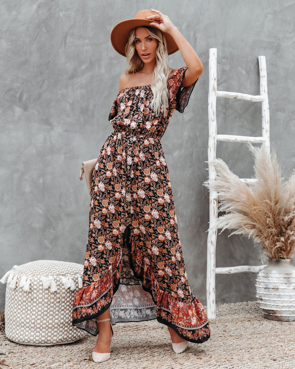 //// Our Liam Floral Off The Shoulder High Low Maxi Dress is modernized boho! Black. salmon. rust. orange. sage. and ivory florals decorate this maxi. Designed in an off the shoulder style. Styled with the El Dorado Hat. 5 Disc Choker. The Buddha Wheel Necklace. Simple Bangle Bracelet. Stella Crossbody Envelope Zip Clutch. and Ritz Faux Suede Pointed Heel.