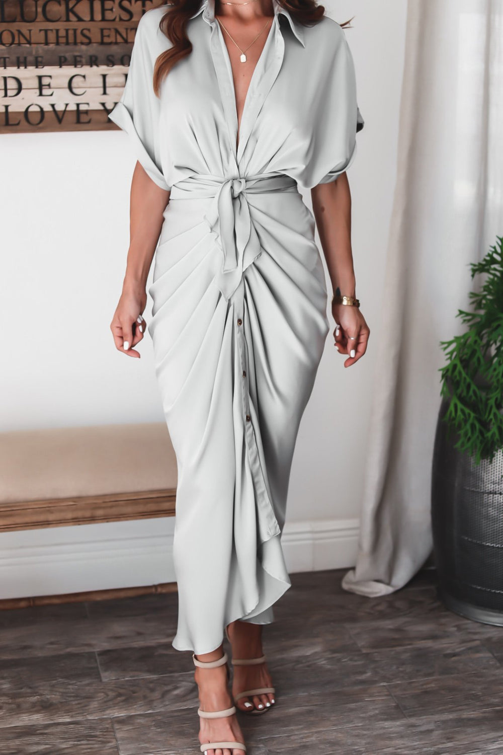 Luv Satin Tie Front Midi Shirt Dress - Olive