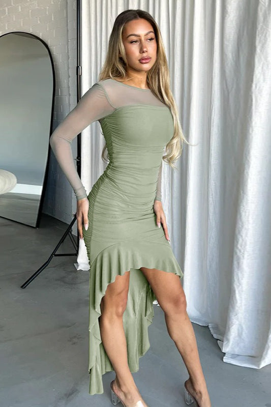Mesh Ruffled Ruched Backless Midi Dress