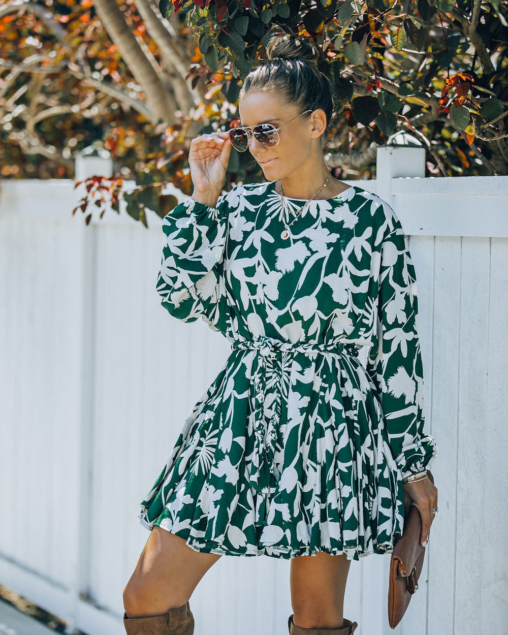 Our Nylah Printed Rope Tie Ruffle Dress is so fun and flirty! This hunter green and ivory printed dress is ruffled to perfection! Designed with a crew neckline and a rope tie closure. Secured with a back button closure. Styled with the Chloe Mini Necklace. Judah Pendant Disc Necklace. Stella Crossbody Envelope Zip Clutch. and Saint Slouch Boot.