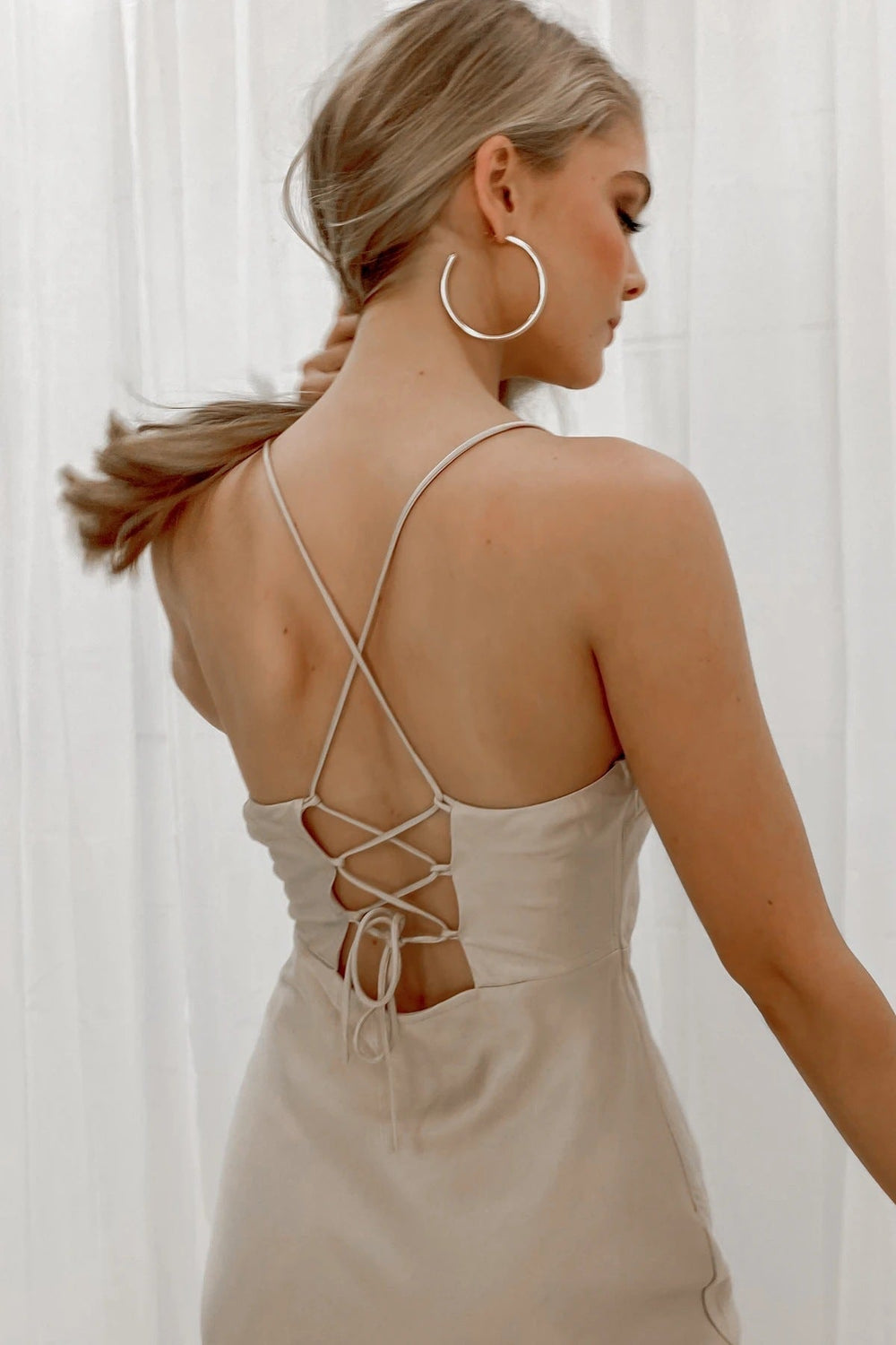 Our Oh What Fun Satin Cowl Neck Midi Dress is waiting to worn at your next holiday party! This champagne hued midi features a cowl neckline. Designed with faux front buttons and a sexy side slit. Styled with the Light Show Statement Earrings. Sienna Tennis Necklace. Chic Crossbody Chain Pouch Bag. and Pia Clear Strap Heel.