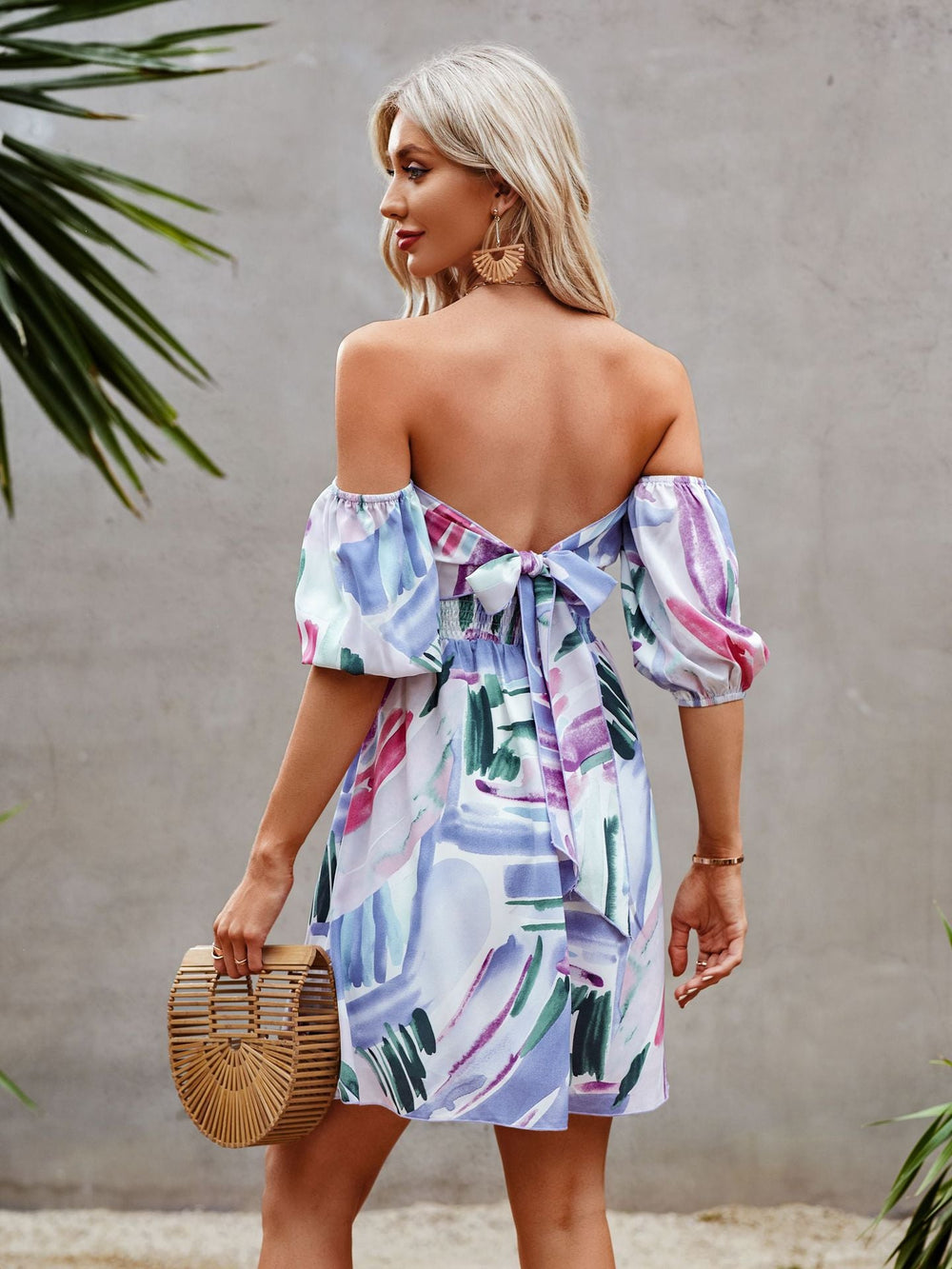 //// Our Palmetto Smocked Off The Shoulder Dress is so adorable with this unique neckline! The ruching through the off the shoulder neckline stretches to fit your size perfectly! We love the criss cross front fit. Complete with a white base and a red. blush. teal. navy. cobalt. and sky blue palm print throughout! Paired with Indigo Twisted Hoops. Chloe Mini Necklace. Elena Pendant Necklace. Compass Coin Necklace. Simple Bangle Bracelet. Stella Crossbody Envelope Zip Clutch. and Cooper Block Heeled Sandal.