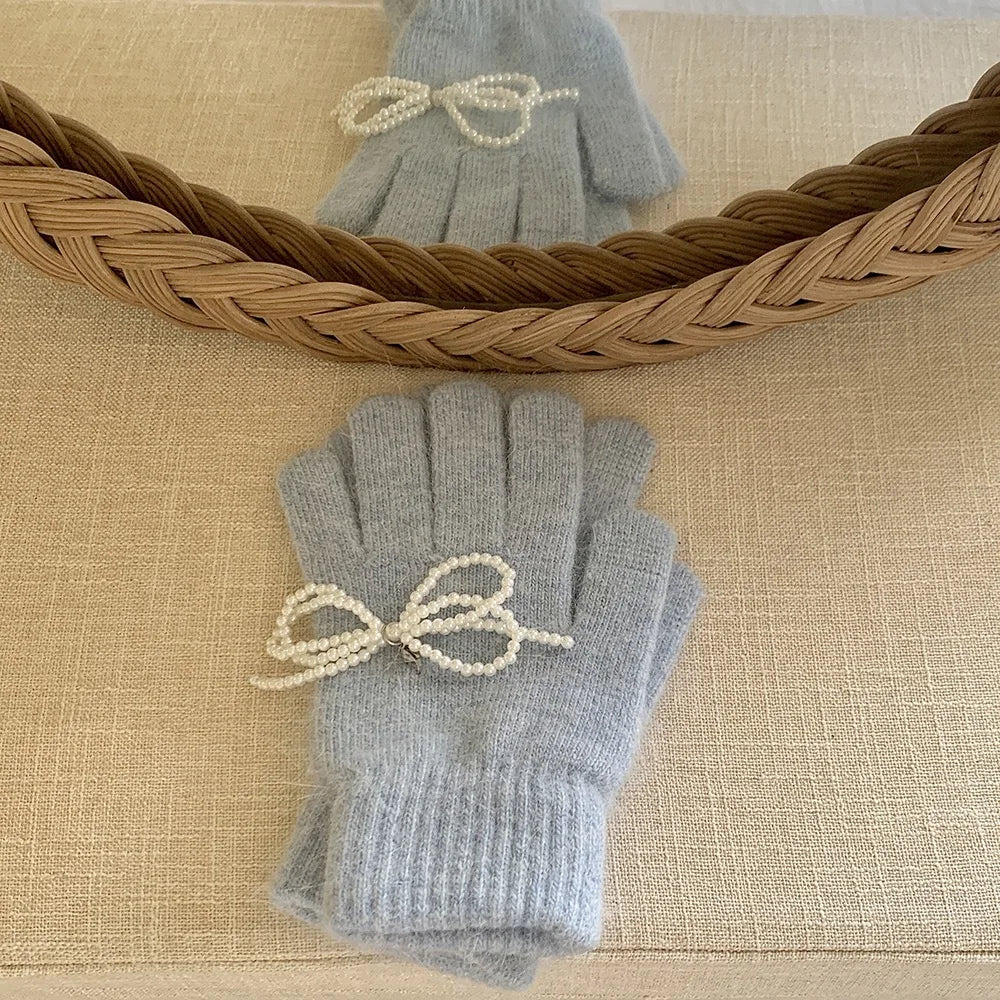 Pearl Bow Knot Winter Wool Furry Thickened Warm Soft Y2k Lolita Cosplay Christmas Gloves