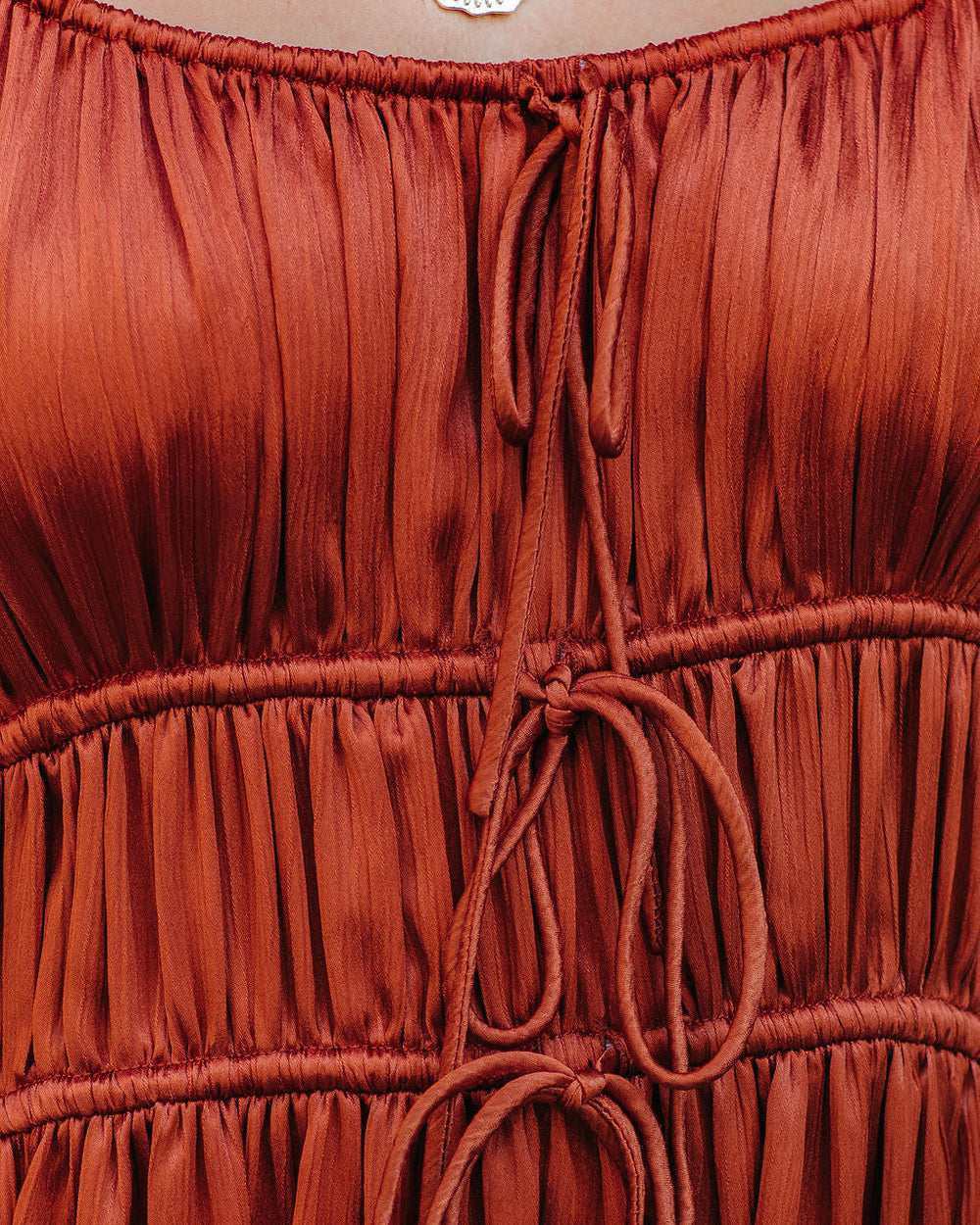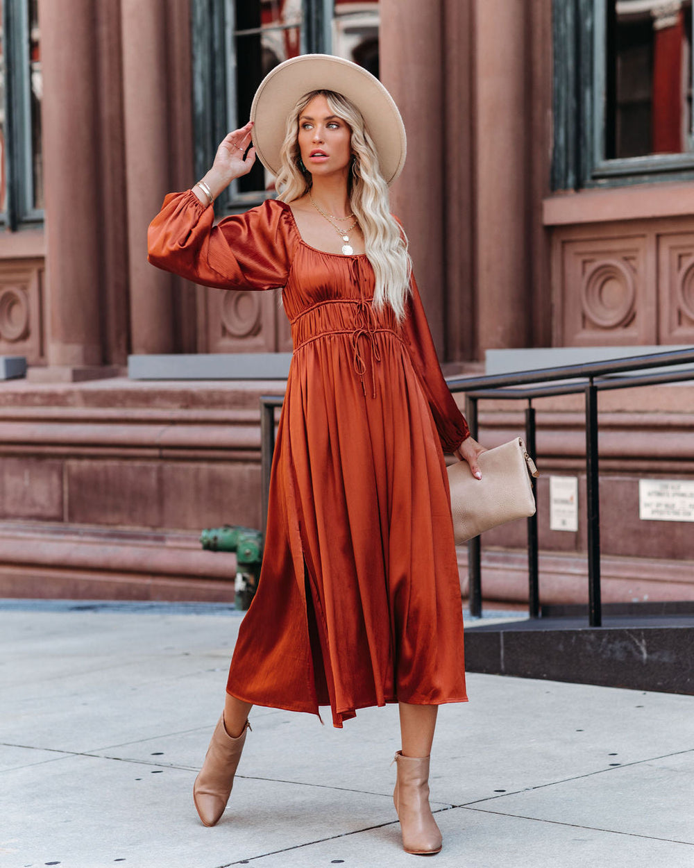 Our Pines Satin Pocketed Drawstring Midi Dress is so luxe! This cognac satin midi features side pockets and adjustable drawstring ties. Elevate this dress with booties or strappy heels. Styled with the El Dorado Hat. Perfect Hoop Earrings. Chloe Mini Necklace. Mosaic Coin Necklace. Sia Toggle Pendant Necklace. Simple Bangle Bracelet. Stella Crossbody Envelope Zip Clutch. and Tribeca Faux Leather Heeled Bootie.