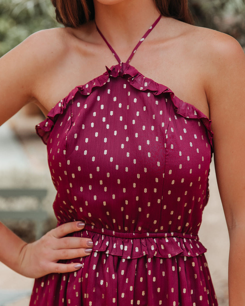 //insstreet Exclusive// Stand out at your next event in our Remarkable Metallic Detailed Halter Midi Dress! This wine halter midi is detailed with gold metallic polka dots. Designed with a ruffle trim and a lined inner. Styled with the Mercury Hoops. Simple Bangle Bracelet. Stella Crossbody Envelope Zip Clutch. and Whimsy Heel.