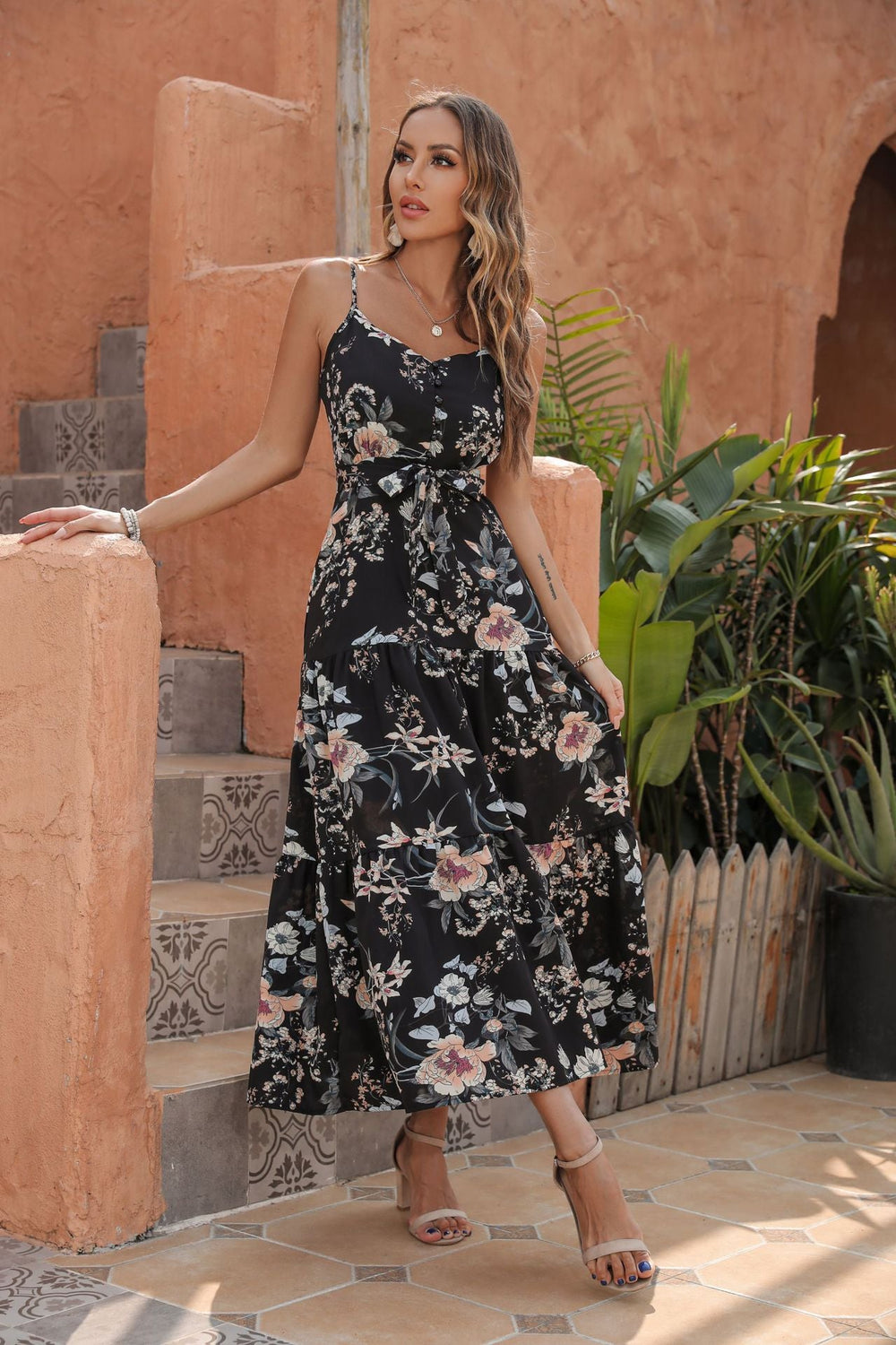 Go wine tasting in our Searching For Balance Floral Maxi Dress! This black maxi is designed with mustard. ivory. blush. peach. yellow. and rust florals. Finished with a back smocking and a plunging neckline. Styled with the Bondi Lace Straw Hat. Perfect Hoop Earrings. 5 Disc Choker. Gaia Coin Necklace. and Simple Bangle Bracelet.