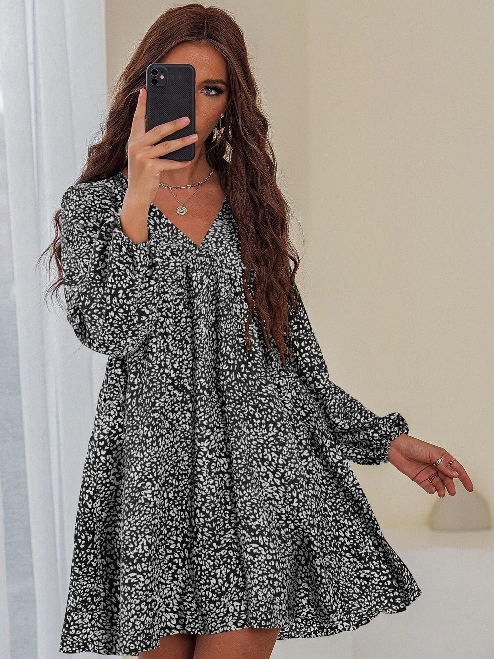 Our Skylar Printed Tie Dress pairs best with OTK boots! Black and beige hues detail this dress. Designed with a removable adjustable waist tie. Finished with a high neckline. Styled with the El Dorado Hat. Perfect Hoop Earrings. Layers Of My Heart Necklace. Simple Bangle Bracelet. Highland Bag. and Saint Slouch Boot.