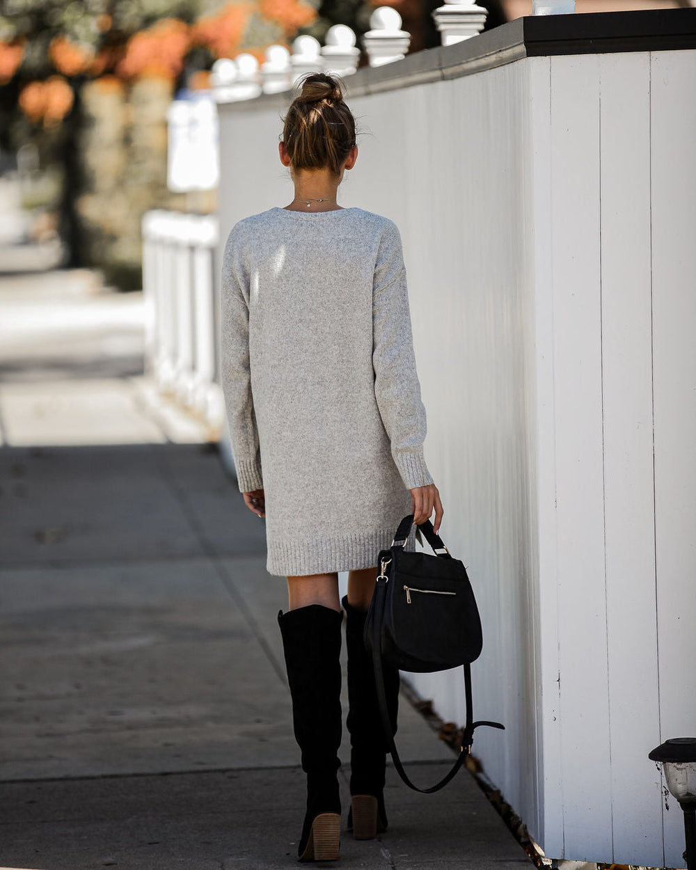 //Best Seller// The Smoky Mountain Sweater Dress is an Autumn staple! Knit from soft grey yarns to fit relaxed and warm with a crew neckline and long sleeves. Detailed with ribbed edges and subtle side slits while a centering seam down the middle elevates the look with a trend-forward touch. Your wardrobe would be incomplete without it. Styled with the Chloe Mini Necklace. The Buddha Wheel Necklace. Saint Slouch Boot and the Highland Bag.