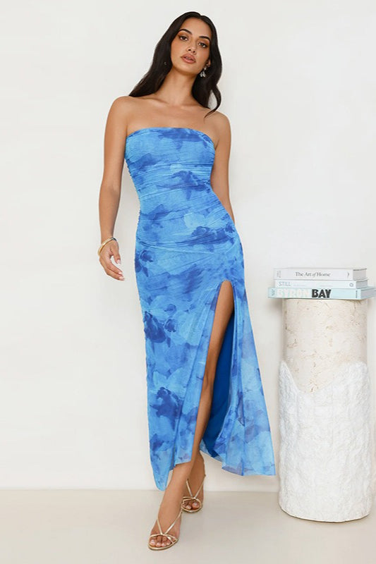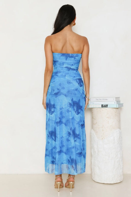 Strapless Printed Ruched Midi Dress