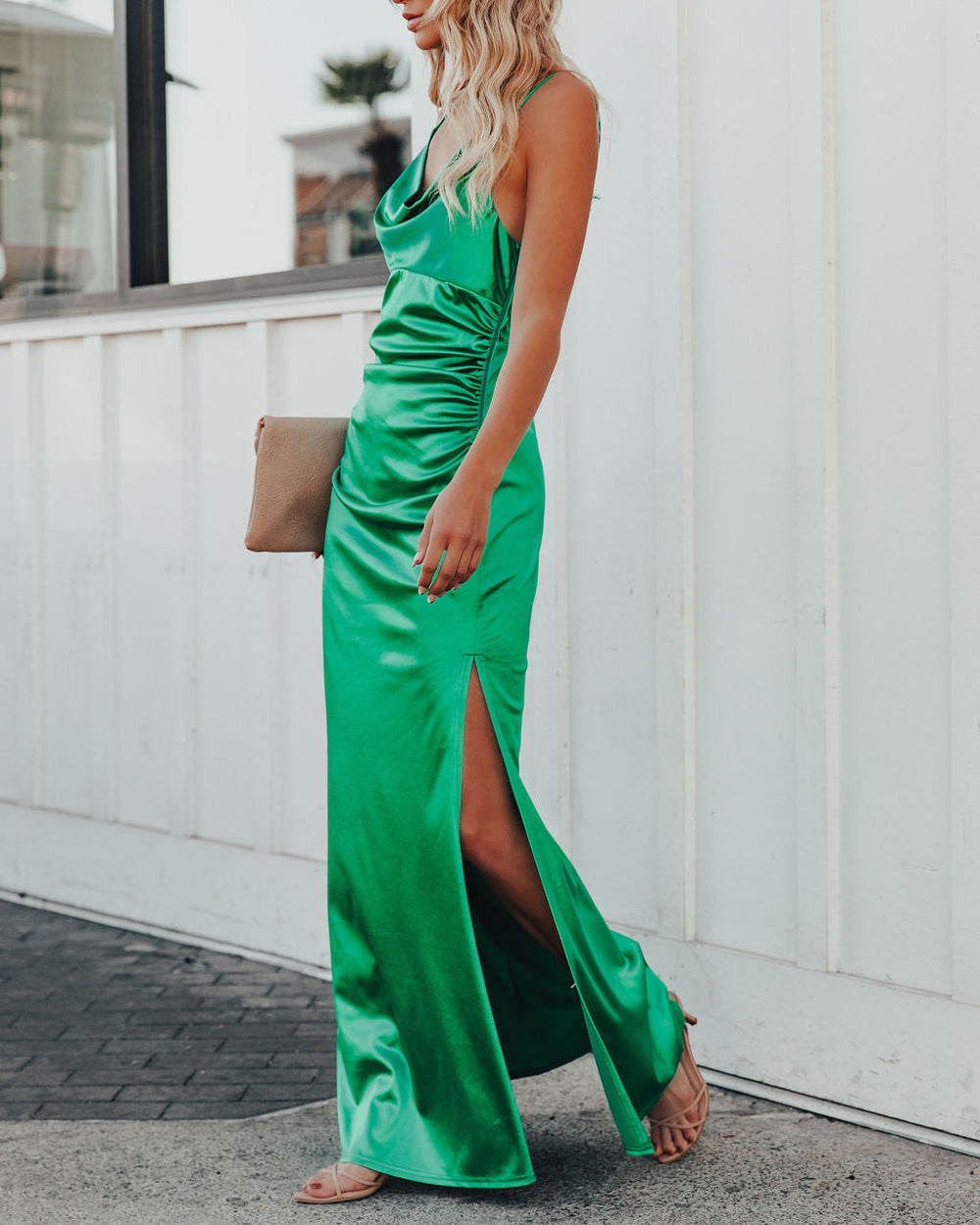 //INSSTREET// Best Seller// New Color// Be the best dressed at the wedding in our Take Care Satin Cowl Neck Maxi Dress! This green hued dress features a back lace detailing. Designed with a side slit and adjustable spaghetti straps. Styled with the Tahiti Hoops. Ara Choker Necklace. Stella Crossbody Envelope Zip Clutch. and Bella Faux Leather Strappy Kitten Heel.